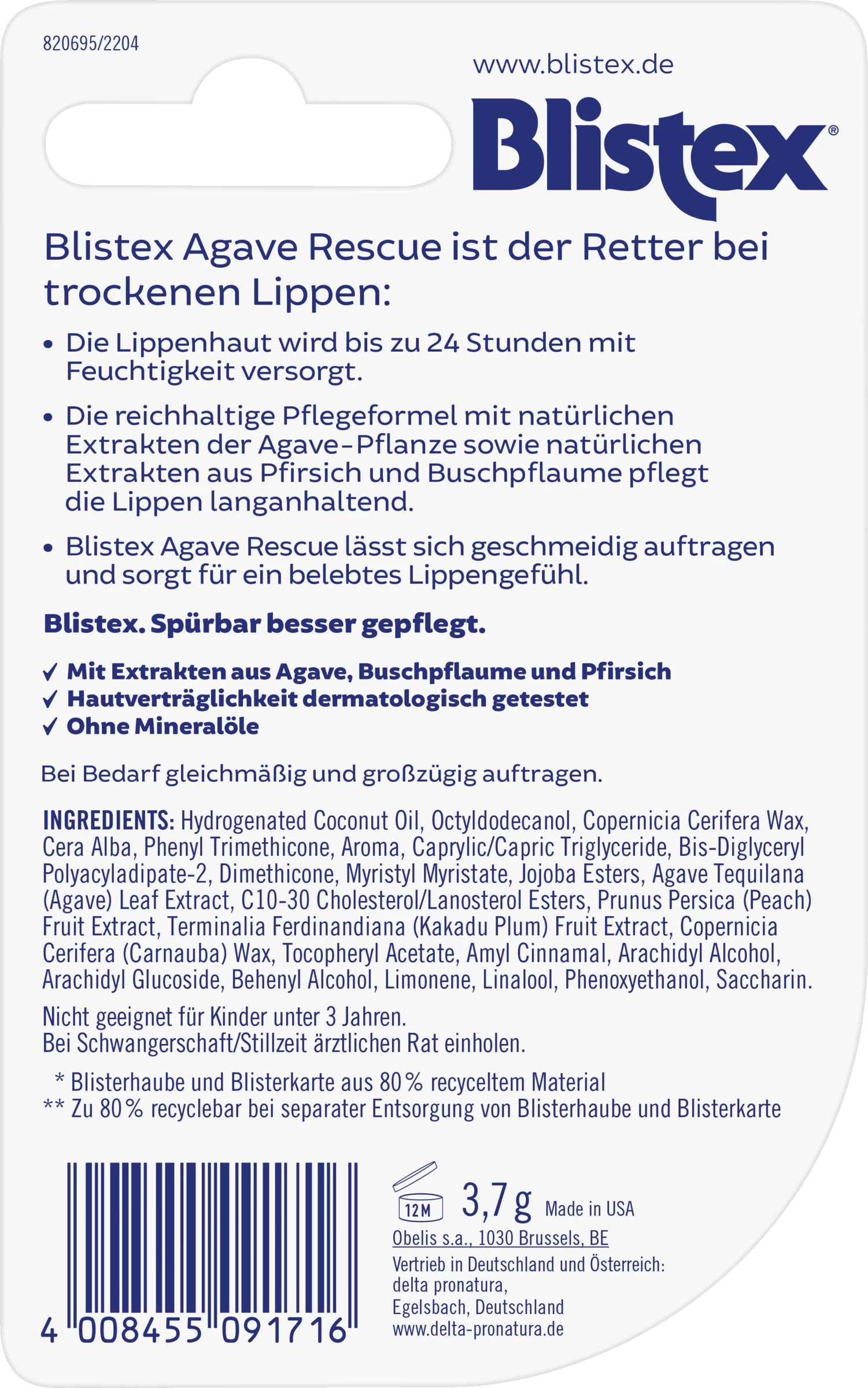Blistex Agave Rescue ist der Retter bei trockenen Lippen. Die Lippenhaut wird bis zu 24 Stunden mit Feuchtigkeit versorgt. Die reichhaltige Pflegeformel mit natürlichen Extrakten der Agave-Pflanze sowie natürlichen Extrakten aus Pfirsich und Buschpflaume pflegt die Lippen langanhaltend. Blistex Agave Rescue lässt sich geschmeidig auftragen und sorgt für ein belebtes Lippengefühl.