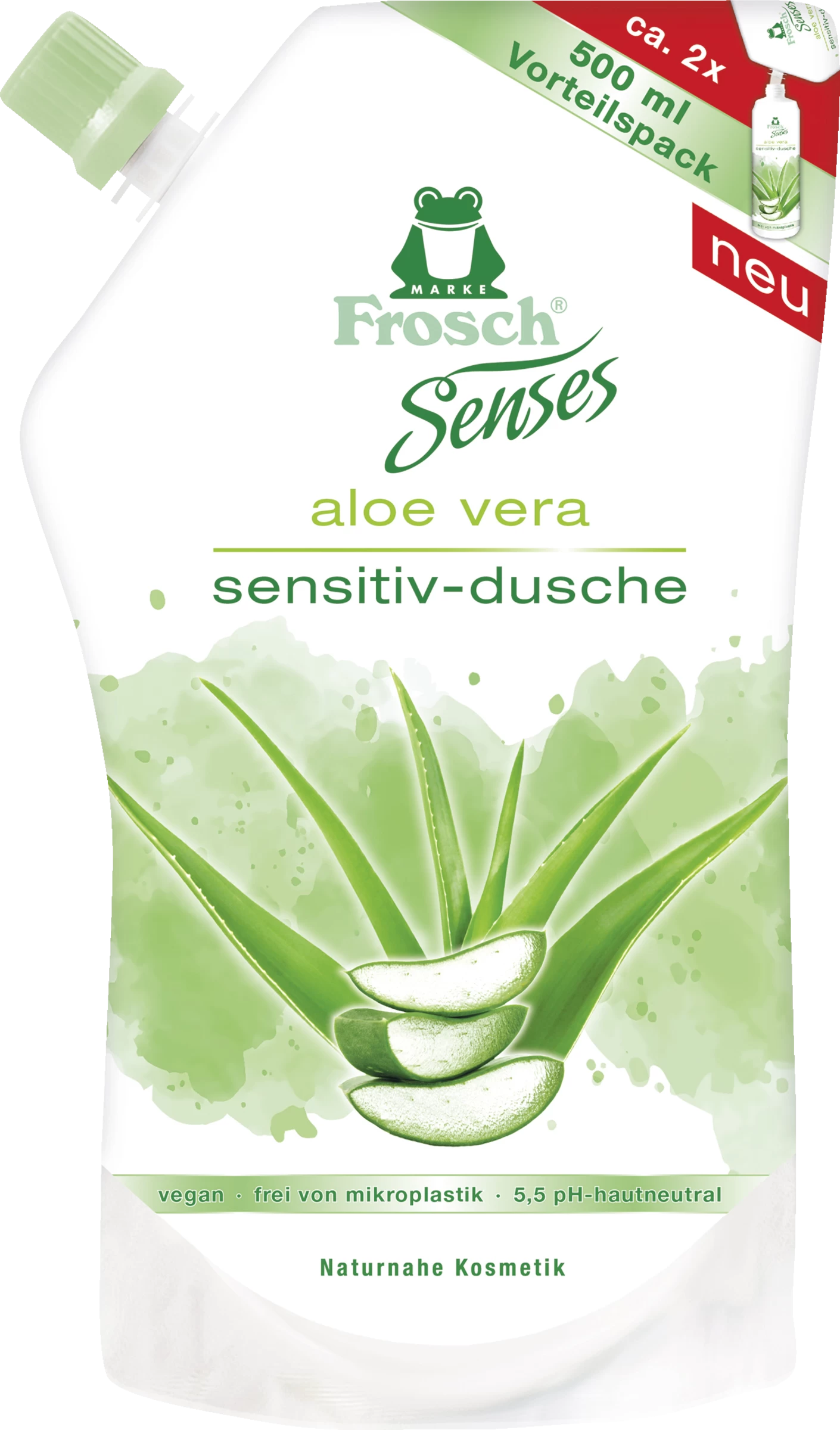 Die Frosch Senses Aloe Vera Sensitiv-Dusche pflegt und reinigt besonders schonend die Haut. Die wertvolle milde pH-hautneutrale Formel mit Aloe Vera-Extrakt sorgt für ein angenehm zartes Hautgefühl. Die Rezeptur ist frei von Mikroplastik, EDTA, Parabenen, Farbstoffen und tierischen Inhaltsstoffen. Die Hautverträglichkeit ist dermatologisch bestätigt. Durch den 100% recycelbaren und wiederverschließbaren Umweltbeutel entsteht weniger Müll bei der Entsorgung.