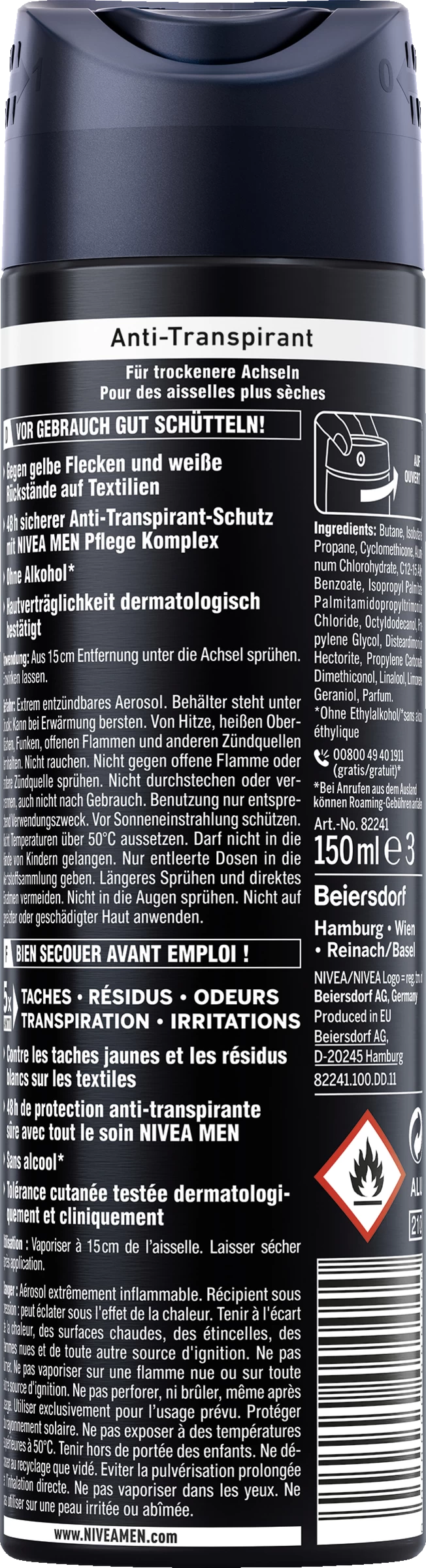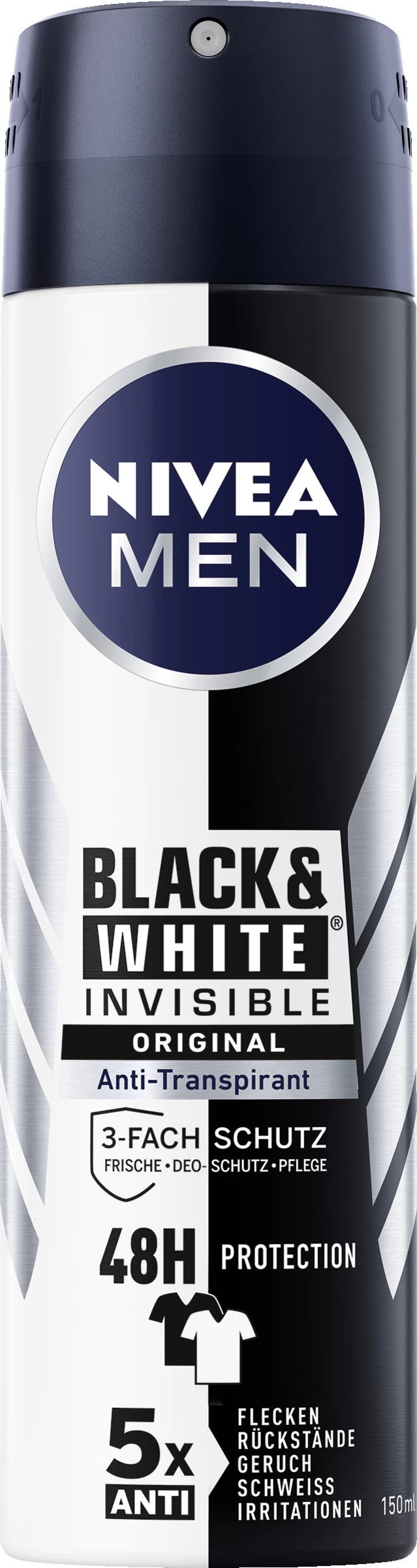NIVEA MEN Black & White Invisible Deodorant Spray bietet zuverlässigen Schutz vor Achselnässe und Körpergeruch – 48 Stunden lang. Die hochwirksame Formel ohne Alkohol schützt vor gelben Flecken auf weißer Kleidung und weißen Rückständen auf dunklen Textilien. Der angenehme Duft kombiniert mit der bewährten sanften NIVEA Pflege – Hautverträglichkeit klinisch bestätigt. Für Deo-Schutz, den man nicht sieht, aber fühlt.