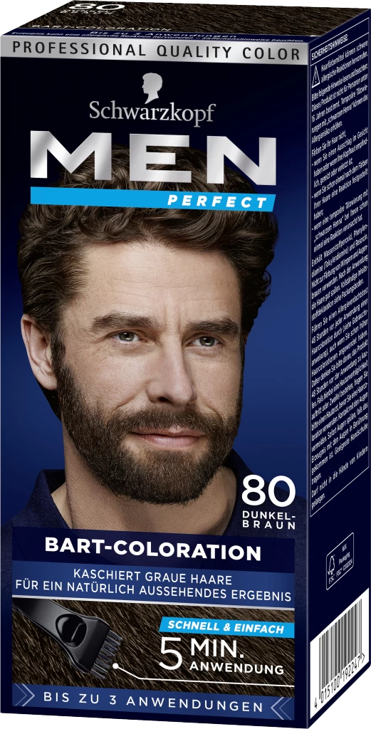 Das neue Schwarzkopf Men Perfect Bart: Unsere erste Coloration, speziell entwickelt für die anspruchsvolle Gesichtsbehaarung von Männern – für einen perfekt aussehenden Bart. Die spezielle Farbmixtur blendet graue Haare aus und sorgt für ein natürlich aussehendes Farbergebnis in nur 5 bis 10 Minuten. Eine diskrete, natürlich aussehende Haarfarbe für den Bart – SCHNELL UND EINFACH.
