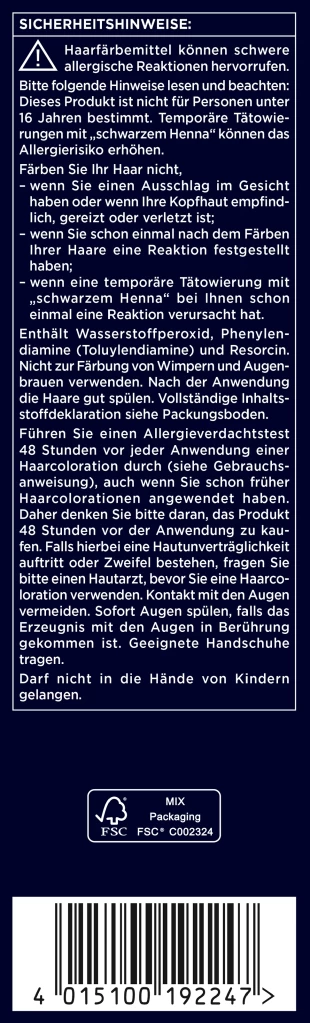 Aqua, Cetearyl Alcohol, Ethanolamine, Toluene-2,5-Diamine Sulfate, Ceteareth-50, Coconut Alcohol, Ceteareth-20, Cocamidopropyl Betaine, 4-Chlororesorcinol, Resorcinol, Parfum, Potassium Hydroxide, Carbomer, Mineral Salts, Sodium Chloride, m-Aminophenol, Sodium Sulfite, Ascorbic Acid, Sodium Silicate, 6-Methoxy-2-Methylamino-3-Aminopyridine HCl, Etidronic Acid, 4-Amino-2-Hydroxytoluene, 1,5-Naphthalenediol.Entwickleremulsion: