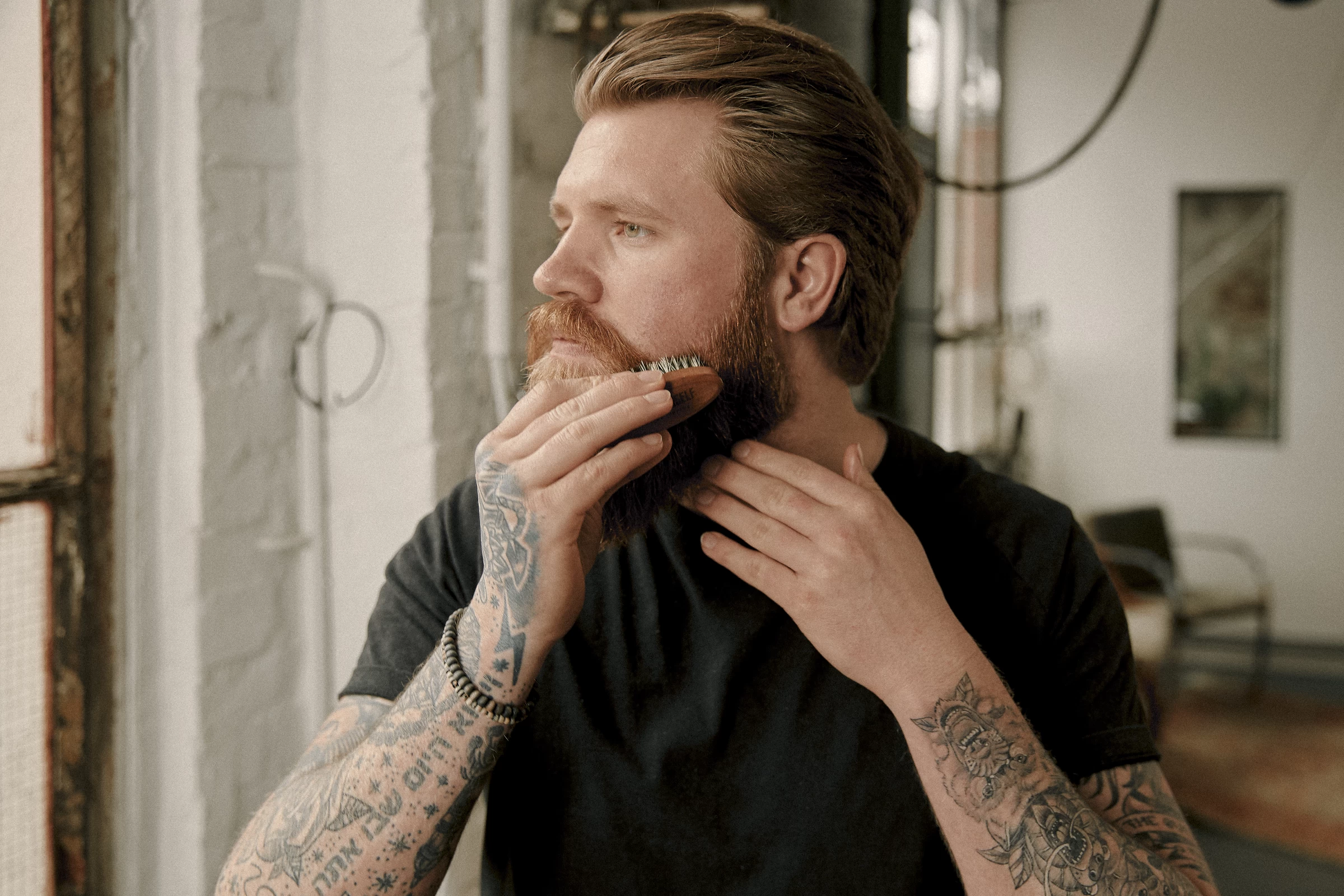 Bürste von oben nach unten über deinen trockenen oder nassen Bart. Nimmst du dazu etwas Bartöl, fühlt er sich noch weicher, glatter und besser an.