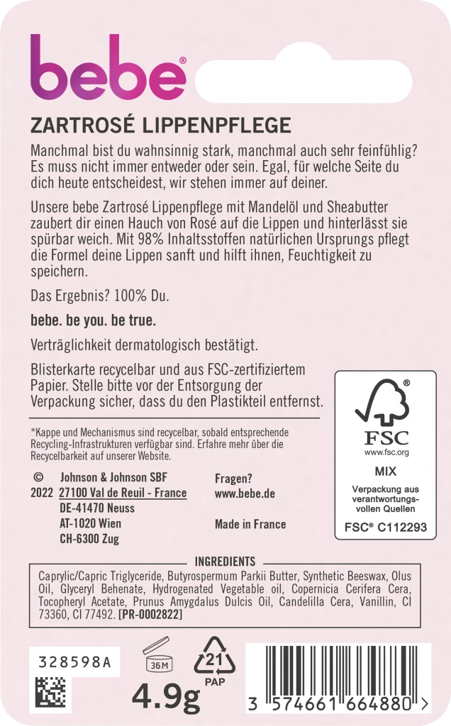Die bebe Zartrosé Lippenpflege mit Mandelöl und Sheabutter zaubert dir einen Hauch von Rosé auf die Lippen und hinterlässt sie spürbar weich. Mit 98% Inhaltsstoffen natürlichen Ursprungs pflegt die Formel deine Lippen sanft und hilft ihnen, Feuchtigkeit zu speichern.