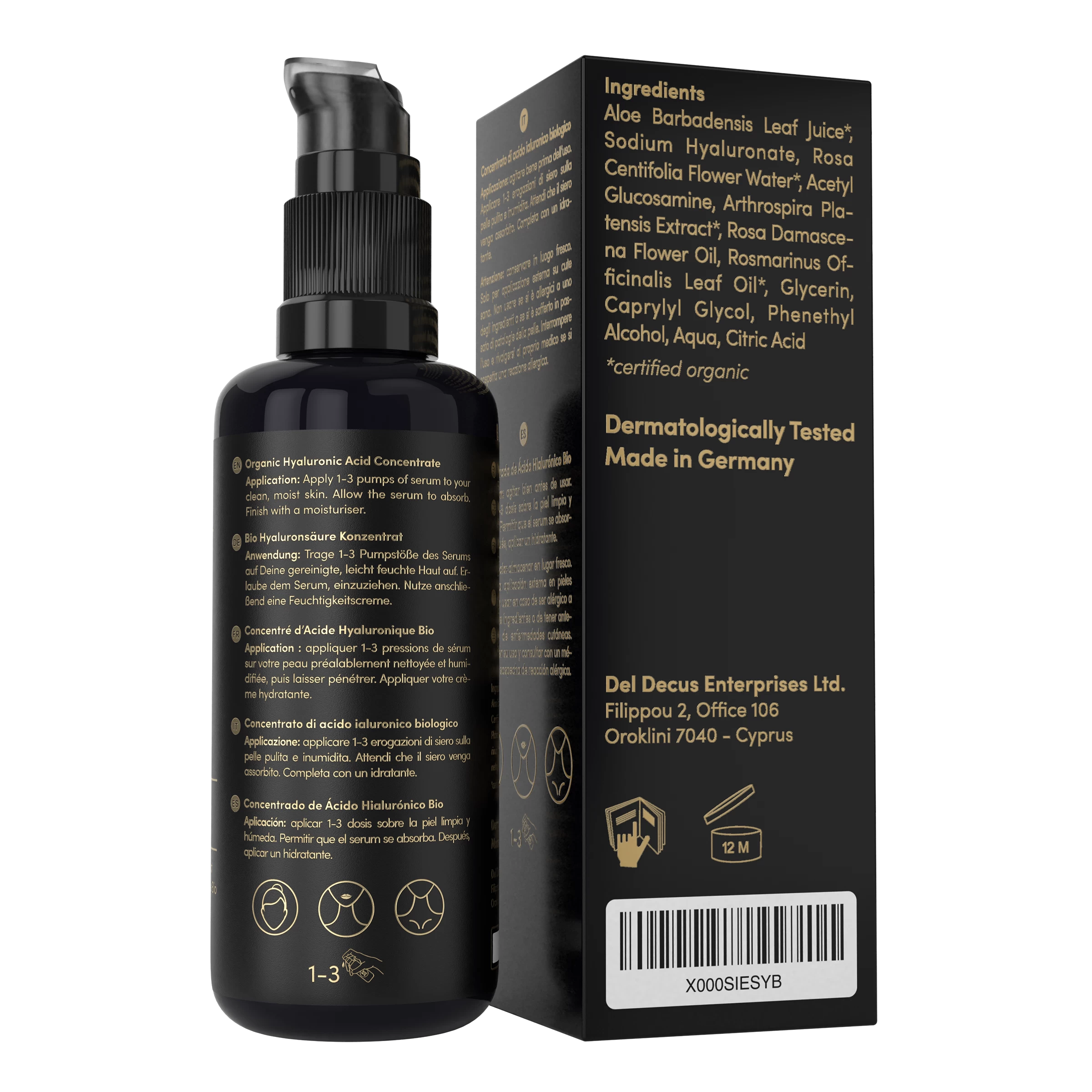 Bio Aloe Vera Direktsaft (Aloe Barbadensis), Natriumhyaluronat (Hyaluronsäure), Bio Provence-Rose Blumenwasser (Rosa Centifolia), Acetylglucosamin, Bio Spirulina Extrakt (Arthrospira Platensis), Rosa Damascena (Damaszener-Rose) Blütenöl, Bio Rosmarin Blattöl (Rosmarinus Officinalis), Glycerin, Caprylyl Glycol, Phenethylalkohol, Aqua, Zitronensäure.