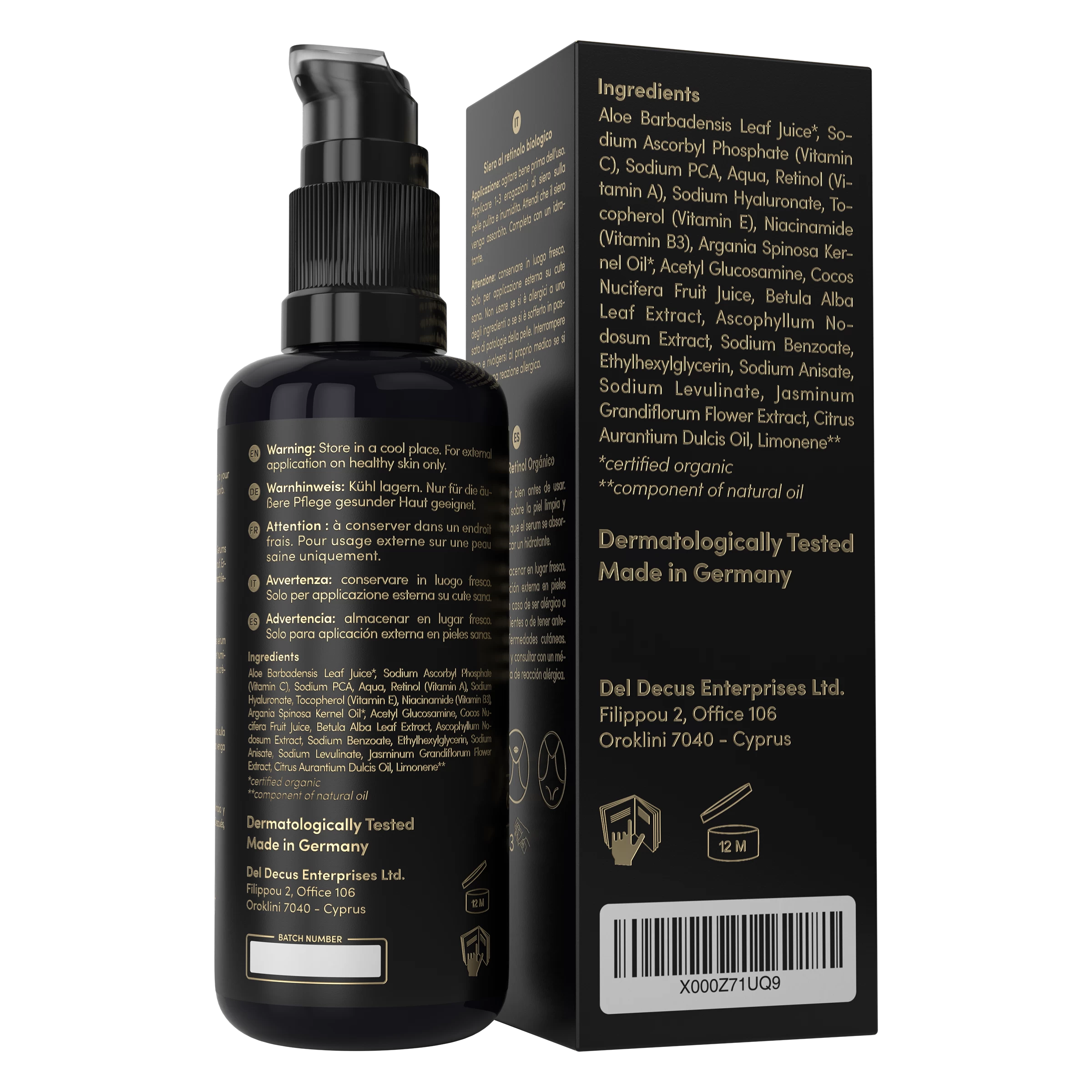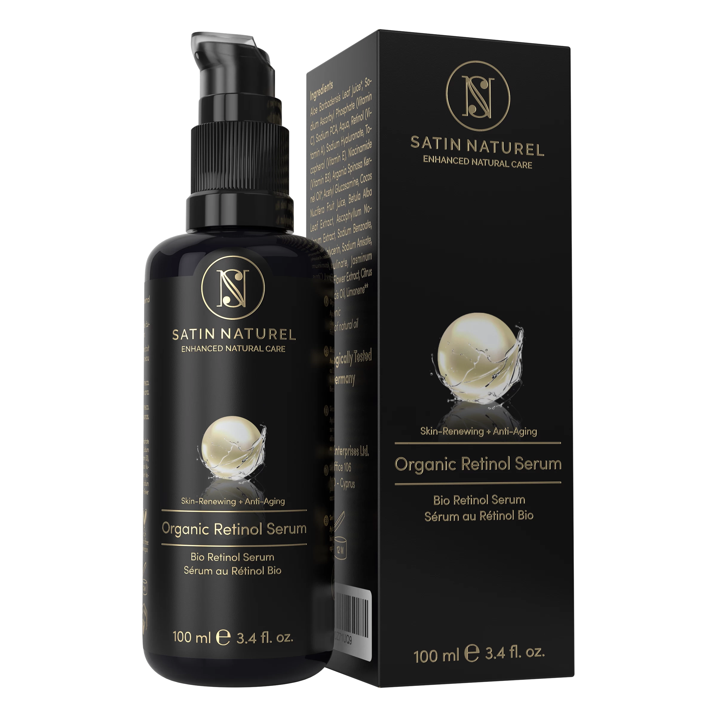 Bio Aloe Vera Direktsaft (Aloe Barbadensis), Natriumascorbylphosphat (Vitamin C), Sodium PCA, Aqua, Retinol (Vitamin A), Natriumhyaluronat (Hyaluronsäure), Tocopherol (Vitamin E), Niacinamid (Vitamin B3), Bio Argan Samenöl (Argania Spinosa), Acetylglucosamin, Cocos Nucifera (Kokosnuss) Fruchtsaft, Betula Alba (Hängebirke) Blattextrakt, Ascophyllum Nodosum (Knotentang) Extrakt, Natriumbenzoat, Ethylhexylglycerin, Natriumanisat, Natriumlevulinat, Jasminum Grandiflorum (Jasmin) Blütenextrakt, Citrus Aurantium Dulcis (Orange) Öl, Limonen.