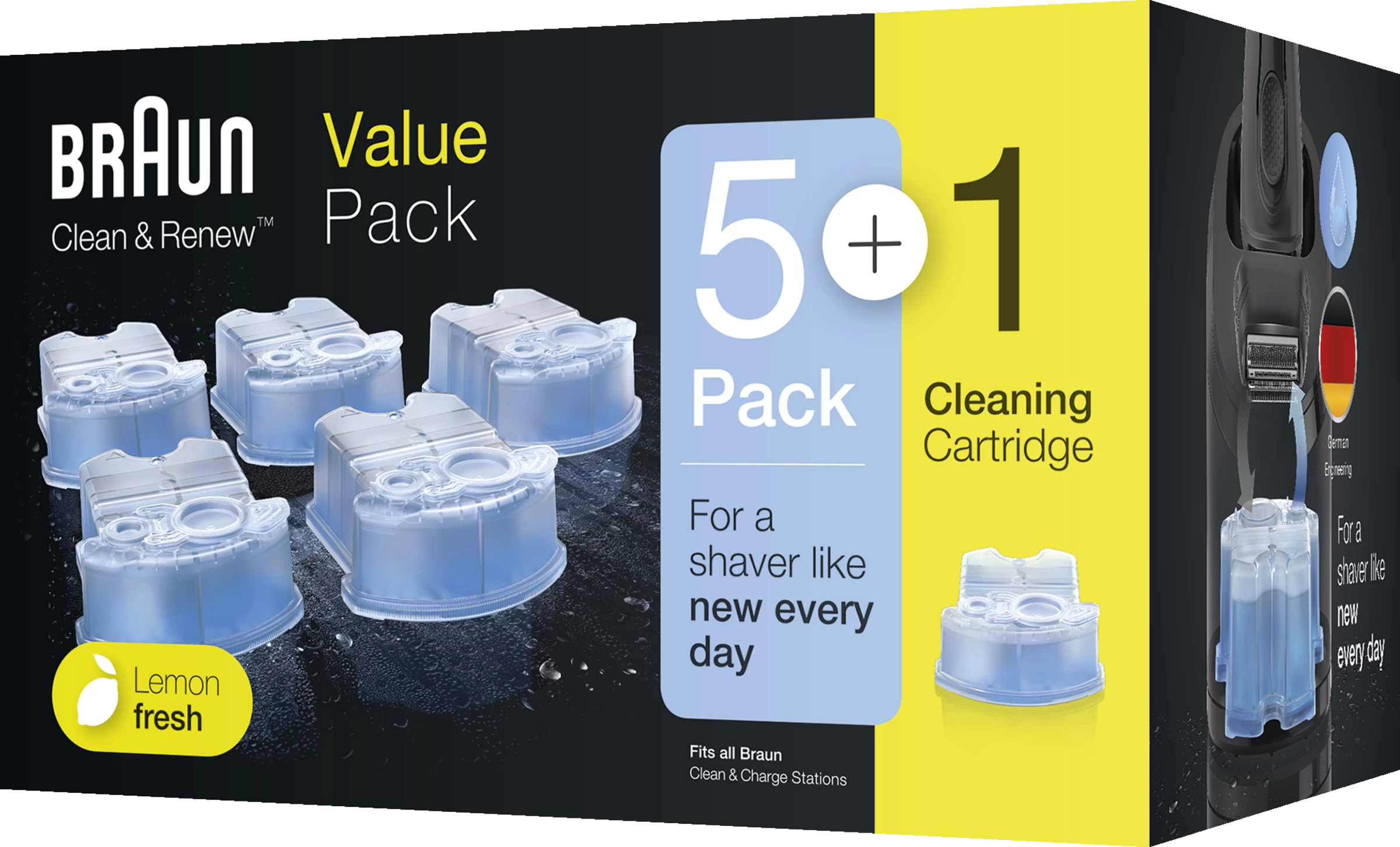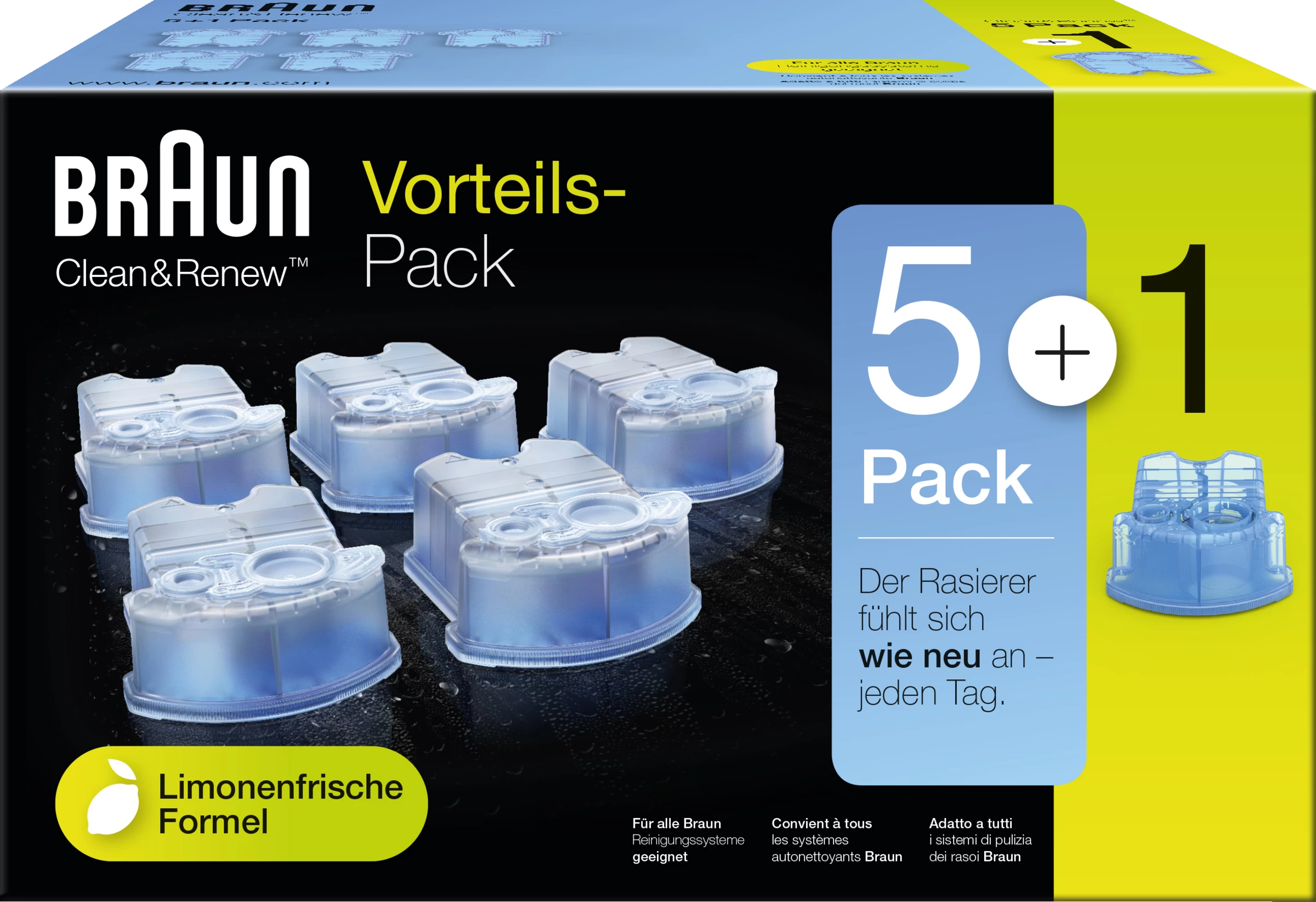 Mit den Braun Clean & Renew Ersatzkartuschen im 5+1-Pack für Ihren Rasierer bleiben Ihre Klingen von Braun im Top-Zustand und ermöglichen auf Dauer eine gründliche und sanfte Rasur. Die zitronenfrische Formel pflegt die Scherteile und sorgt für ein erfrischendes Rasiererlebnis mit Ihrem Elektrorasierer für Herren. Die Reinigungslösung auf alkoholischer Basis ist nachweislich 10-mal hygienischer als die Reinigung Ihres Rasierers unter fließendem Wasser und entfernt 99,9 % aller Keime.