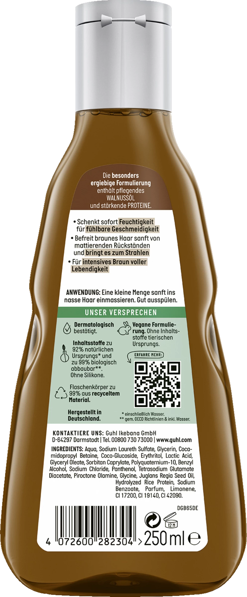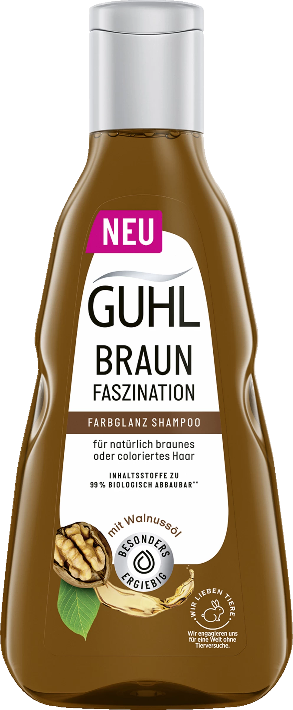 Guhl Braun Faszination – Die silikonfreie Serie für braunes Haar. Die Braun Faszination Serie ist eine Wohltat für Ihre Haare und gleichzeitig schonend zur Umwelt. Die neue Formulierung enthält überwiegend Inhaltsstoffe natürlichen Ursprungs. Neben dem pflegenden Walnussöl, welches braunes Haar zum Strahlen bringt, und stärkenden Proteinen sind nahezu alle Inhaltsstoffe biologisch abbaubar. Dabei sind alle Produkte der Serie besonders ergiebig. Zusätzlich überzeugt die umweltfreundliche Serie mit Ihrer veganen Formulierung und einem Flaschenkörper, der recycelbar ist. So geht nachhaltig!
