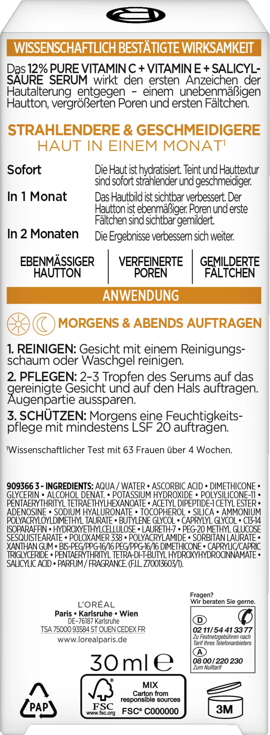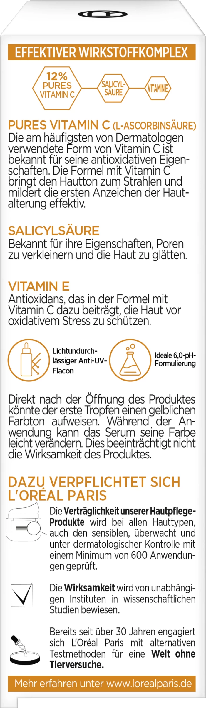 Das 12% PURE VITAMIN C + VITAMIN E + SALICYLSÄURE SERUM wirkt den ersten Anzeichen der Hautalterung entgegen – einem unebenmäßigen Hautton, vergrößerten Poren und ersten Fältchen.