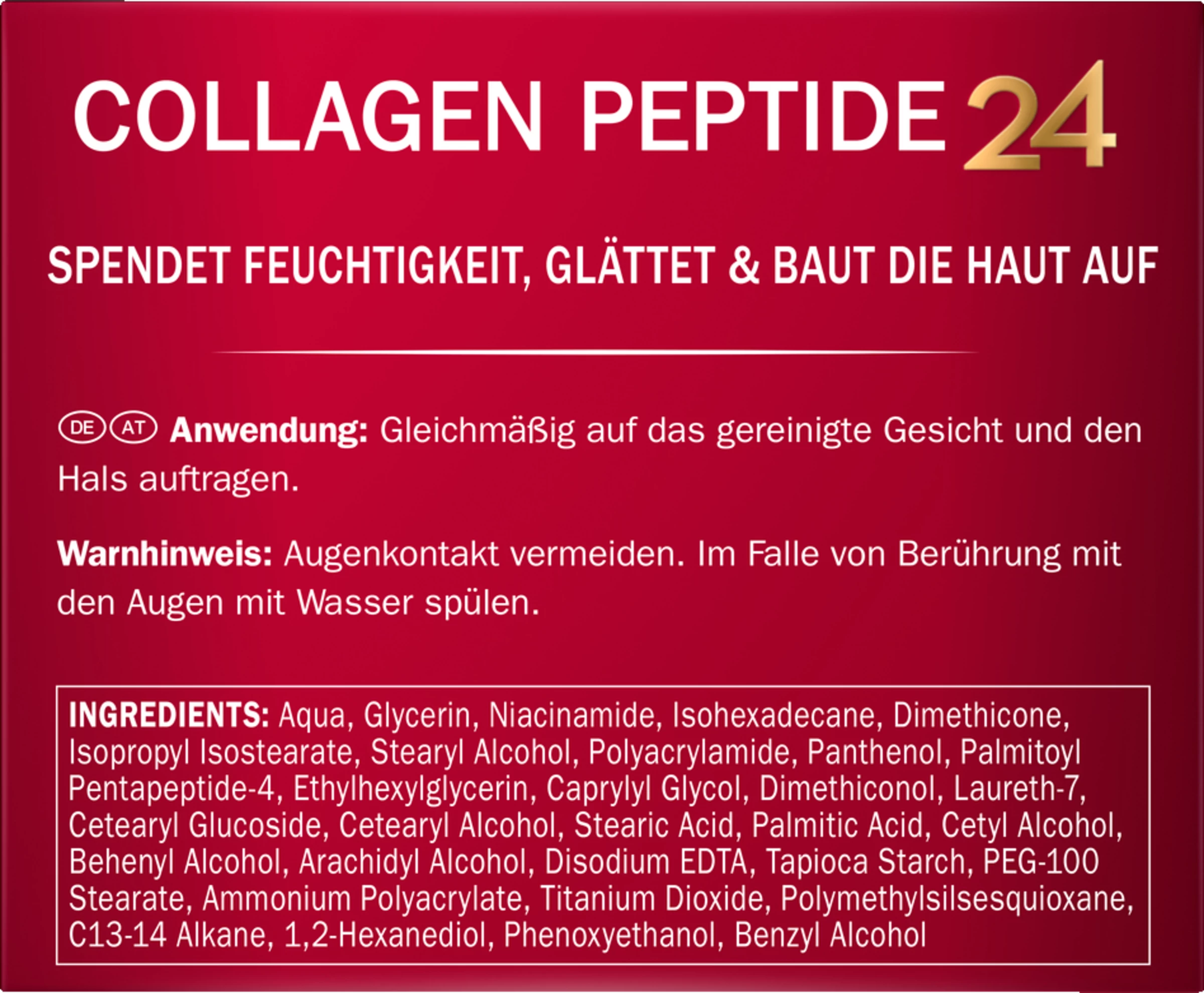 Sichtbar starke und strahlende Haut in 14 Tagen mit der Olay Collagen Peptide24 Tagescreme. Wussten Sie, dass Kollagen ein wesentlicher Bestandteil der Haut ist? Mit zunehmendem Alter – etwa ab den Dreißigern – nimmt die Menge an Kollagen in der Haut ab, wodurch die Haut Anzeichen für Ermüdungserscheinungen aufweist. Die Tagescreme von Olay wird mit Kollagen-Peptiden angereichert, die im Gegensatz zu Kollagenmolekülen bis zu 10 Schichten tief in die Hautoberfläche eindringen können. Zusammen mit Vitamin B3 wirkt die Formel schnell und spendet Ihrer Haut 24 Stunden lang intensive Feuchtigkeit. Außerdem hilft sie im Lauf der Zeit dabei, die Hautstruktur zu glätten und ihre Schutzbarriere wiederherzustellen – für eine starke und strahlende Haut. Die leichte Collagen Peptide24 Tagescreme ist parfümfrei und frei von Farbstoffen. Verwenden Sie die Olay Collagen Peptide24 Tagescreme 28 Tage lang und sehen Sie, wie sich Ihre Haut verwandelt. Die Olay Collagen Peptide24 Tagescreme ist für die tägliche Anwendung geeignet.