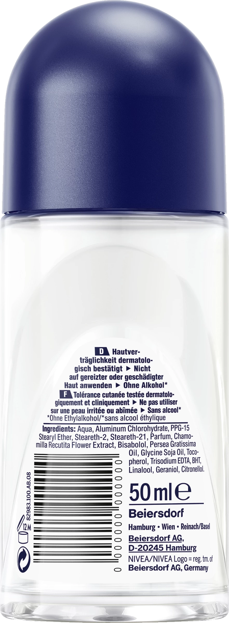 Aqua, Aluminum Chlorohydrate, PPG-15 Stearyl Ether, Steareth-2, Steareth-21, Parfum, Chamomilla Recutita Flower Extract, Bisabolol, Persea Gratissima Oil, Glycine Soja Oil, Tocopherol, Trisodium EDTA, BHT, Linalool, Geraniol, Citronellol