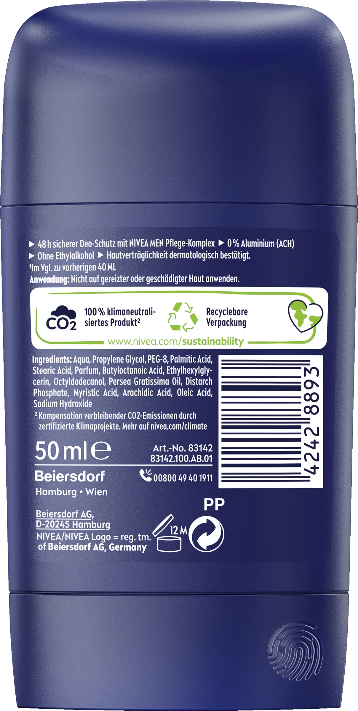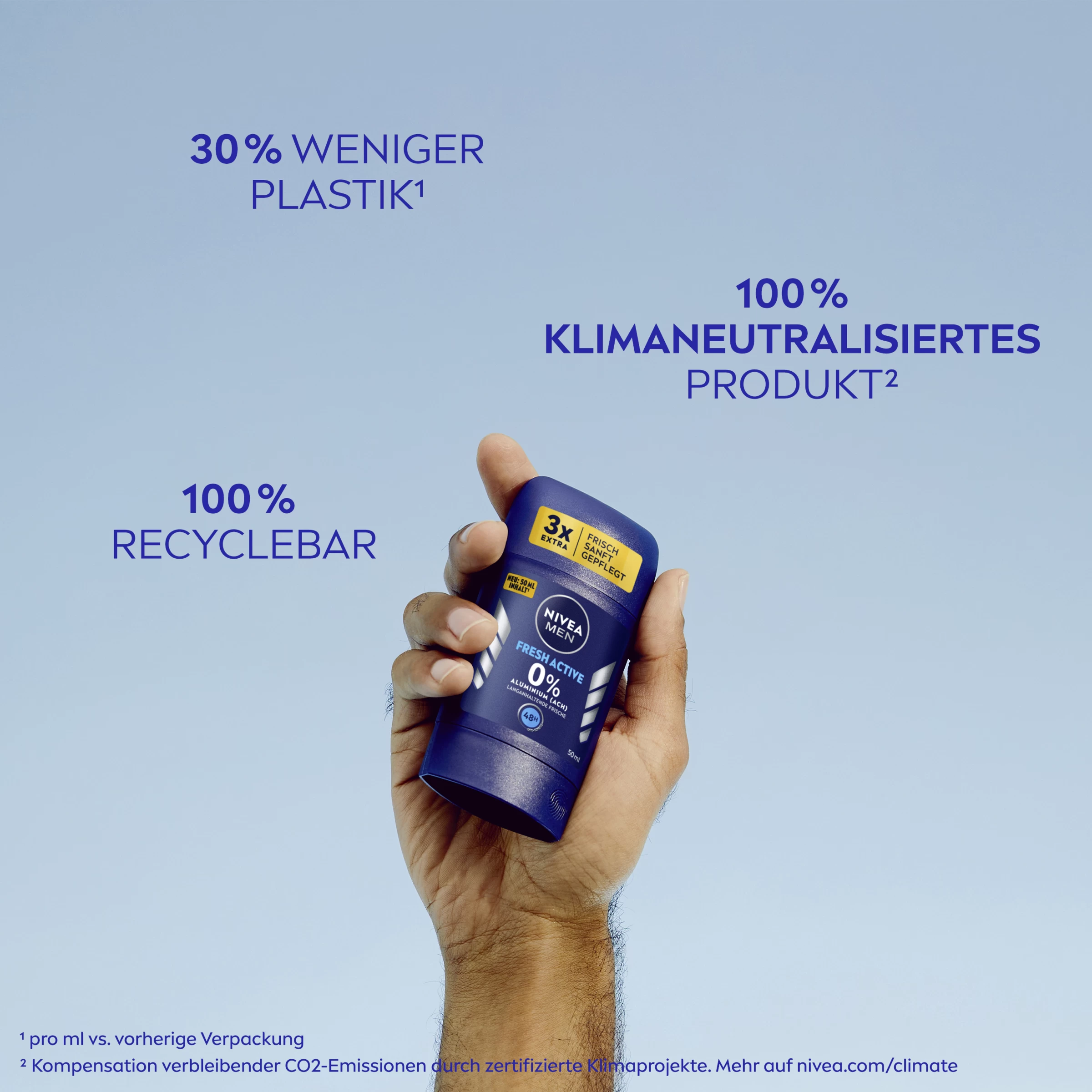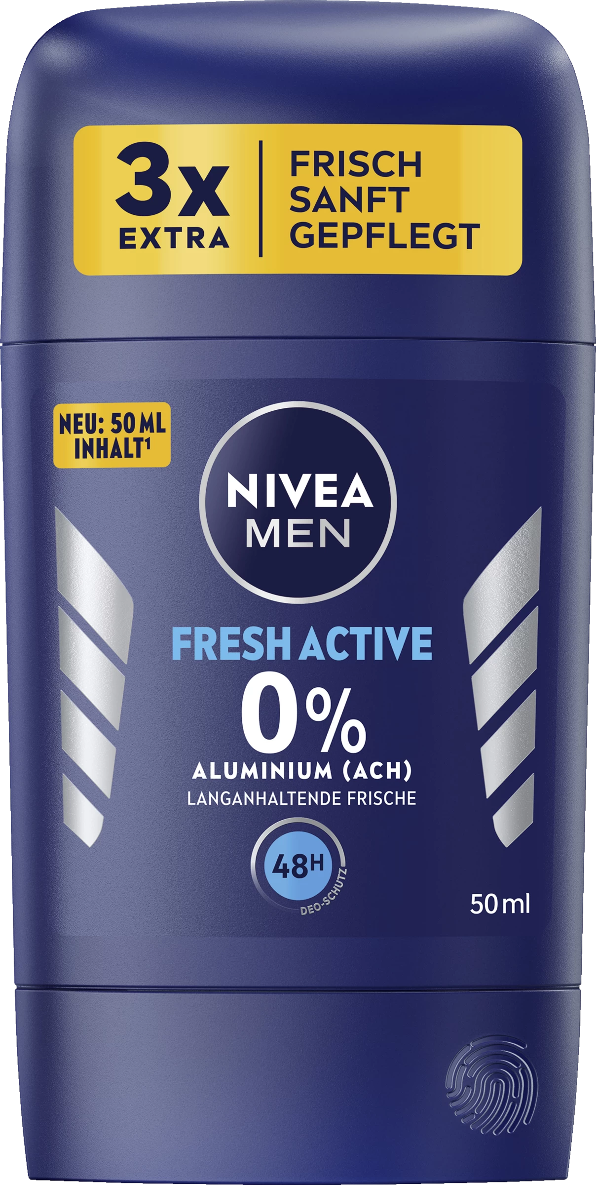 Der NIVEA MEN Fresh Active Stick bietet sicheren Deo-Schutz ohne Aluminium (ACH) – 48 Stunden lang. Die Formel mit Meeresextrakten sorgt für ein langanhaltendes, natürliches Frischegefühl. Der Stick ist in einer zu 98% recycelbaren Verpackung verfügbar.