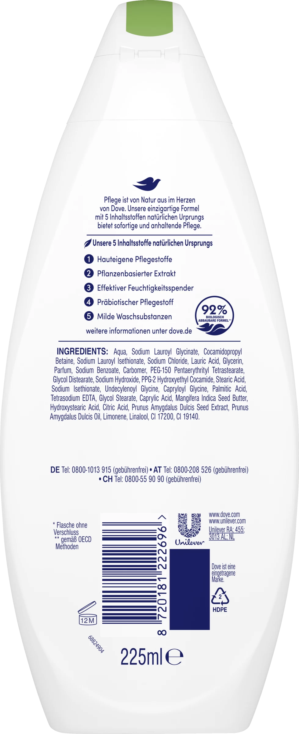Entdecke die Dove Care by Nature Pflegedusche Belebend! Durch ihre einzigartige Formulierung mit 5 Inhaltsstoffen natürlichen Ursprungs ist sie besonders hautfreundlich und lang anhaltend wirksam. Dove Care by Nature Pflegedusche Belebend duftet herrlich nach Mangobutter und Mandelextrakt.