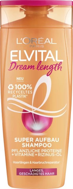 Traumhaftes, langes Haar? Aber es ist nicht ganz so einfach wie gedacht? Unsere Haare machen eine Menge mit: Stylen und Umwelteinflu¨sse strapazieren. Haarlängen werden bru¨chig und die Spitzen werden trocken. Dank unserem SUPER AUFBAU SHAMPOO, mit seiner cremigen Pflegeformel, gehören geschädigte Längen schnell der Vergangenheit an. Unser SUPER AUFBAU SHAMPOO mit PFLANZLICHENPROTEINEN, VITAMINEN und RIZINUS-ÖL: REPARIERT das Haar bis in die Spitzen, STÄRKT die Haare, SPENDET FEUCHTIGKEIT und bringt das Haar zum Glänzen.Unsere Geheim-Formel fu¨r lange Haare.