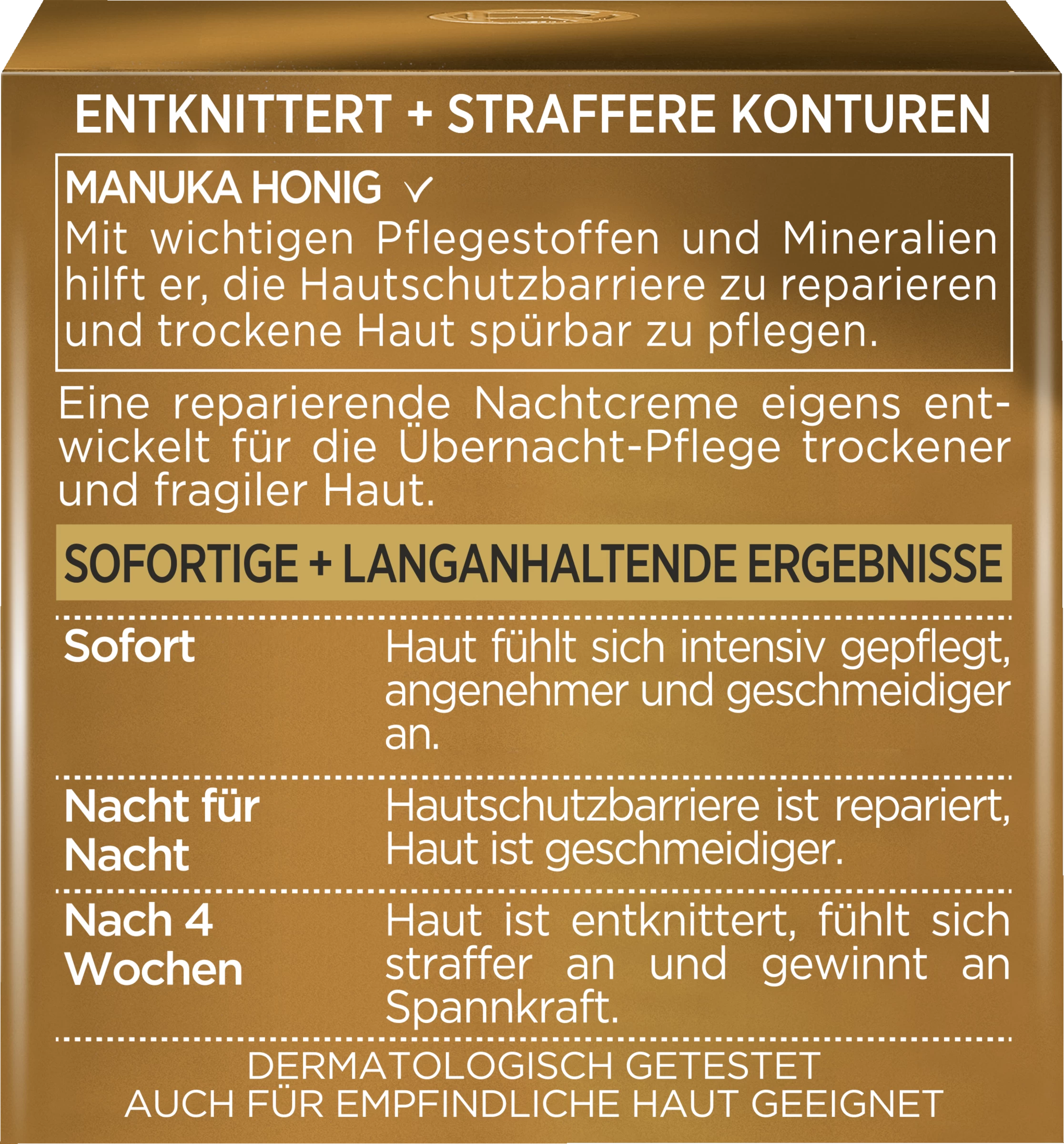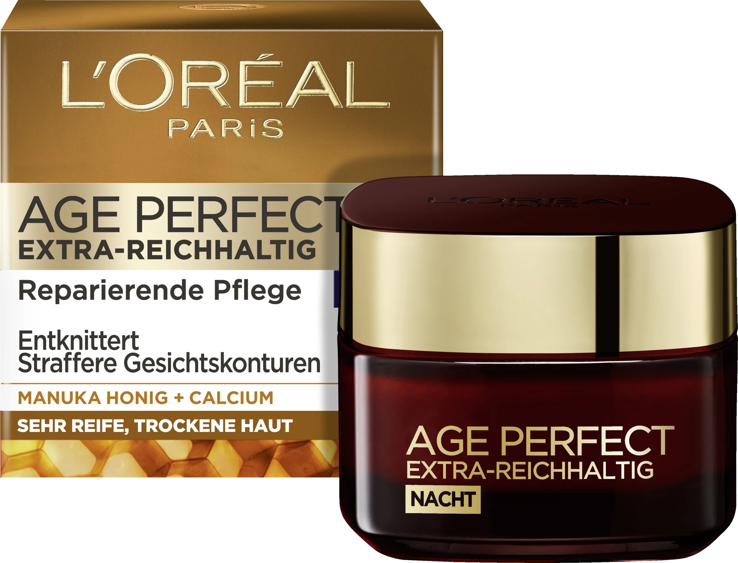 Die neue Age Perfekt Extra-Reichhaltig Nachtpflege für sehr reife und trockene Haut: Die Formel mit Manuka Honig und Calcium strafft, pflegt intensiv und mildert Knitterfalten über Nacht. Mit zunehmendem Alter verliert die Haut die Fähigkeit, die hauteigenen Fette in ausreichendem Maße selbst zu produzieren. Die Haut wird deutlich trockener und fragiler. Hierdurch entstehen Spannungsgefühle und Knitterfalten. Die Haut verliert an Strafftheit – Die Lösung: Die reparierende intensiv-pflegende Wirkung von Manuka Honig. Schon lange Zeit ist dieser als Medizin den einheimischen Maori-Stämmen in Neuseeland bekannt. Die Formel mit Manuka Honig baut sie durch reichhaltige Lipide und Nährstoffe die Haut wieder auf und pflegt sie intensiv. Die Haut ist spürbar geschmeidiger für ein ausgeprägtes Wohlbefinden ohne Spannungsgefühle.