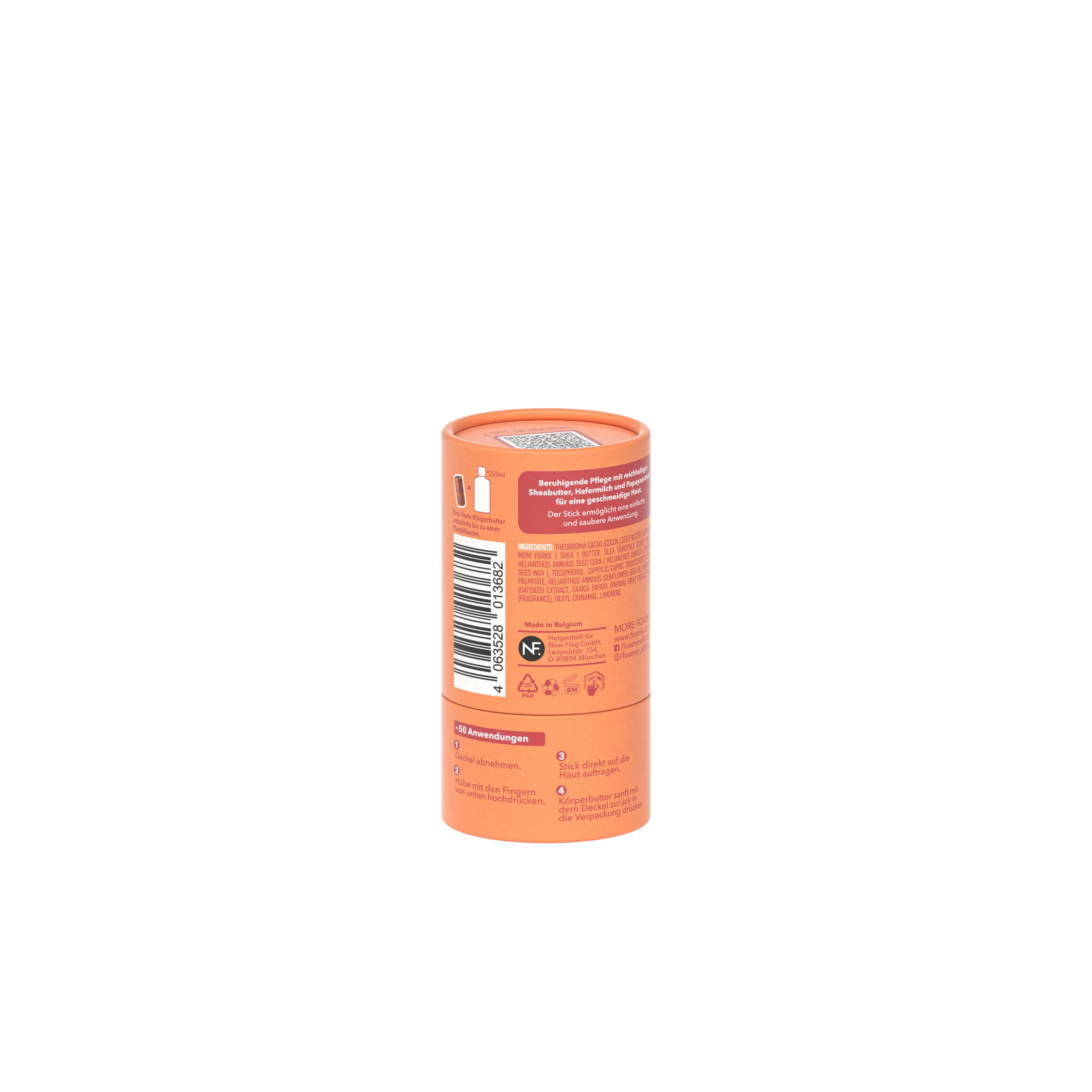 Beruhigende Pflege mit reichhaltiger Sheabutter, Hafermilch und Papayaextrakt für eine geschmeidig Haut. Der Stick ermöglicht eine einfache und saubere Anwendung.