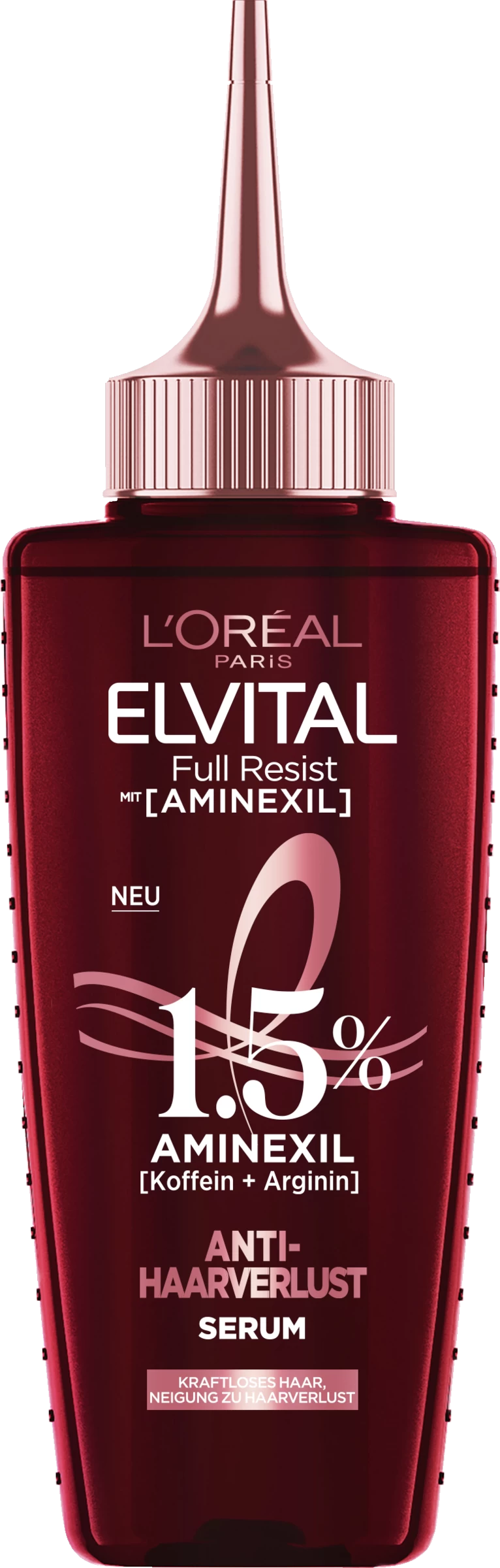 Das Elvital Full Resist Anti-Haarverlust Serum von L’Oréal Paris ist ein Haarserum für kraftloses Haar, mit der Neigung zu Haarverlust. Dank seiner reichhaltigen Formel stärkt das Serum das Haar direkt an der Haarwurzel und reduziert so, durch eine wissenschaftliche Studie bewiesen, den Haarausfall bei Frauen. Angereichert mit 1,5 % Aminexil unterstützt das Serum gegen Haarverlust von L’Oréal Paris zudem das natürliche Wachstum der Haare. Für mehr Fülle und gesünder aussehendes Haar.