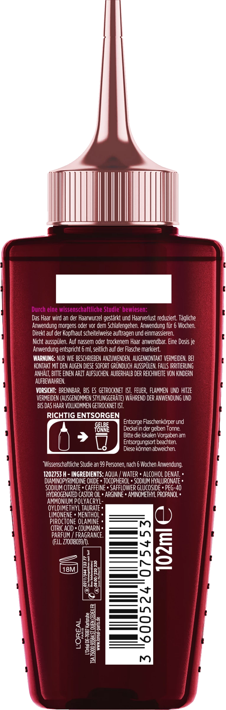 Das Elvital Serum bei Haarverlust direkt auf die trockene oder nasse Kopfhaut scheitelweise auftragen und einmassieren. Nicht ausspülen. Eine Dosis je Anwendung entspricht 6 ml des Produktes gegen Haarausfall, seitlich auf der Flasche markiert.