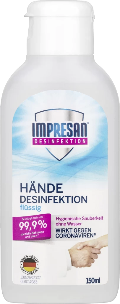 Keime werden besonders schnell über die Hände übertragen. Besonders verbreiten sich Keime an Gegenständen die oft und von unterschiedlichen Leuten angefasst werden. Mit der IMPRESAN Händedesinfektion schützen Sie sich und Ihre Familie vor speziellen Bakterien und Viren, egal ob zuhause oder unterwegs. Bei richtiger Anwendung desinfiziert die Händedesinfektion Ihre Hände bereits nach 30 Sekunden und beseitigt dabei mehr als 99,9 % spezieller Bakterien und Viren.