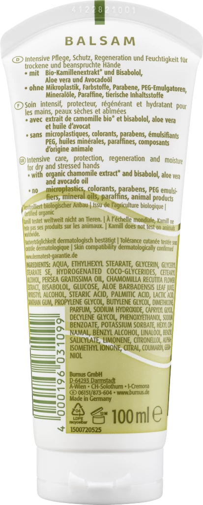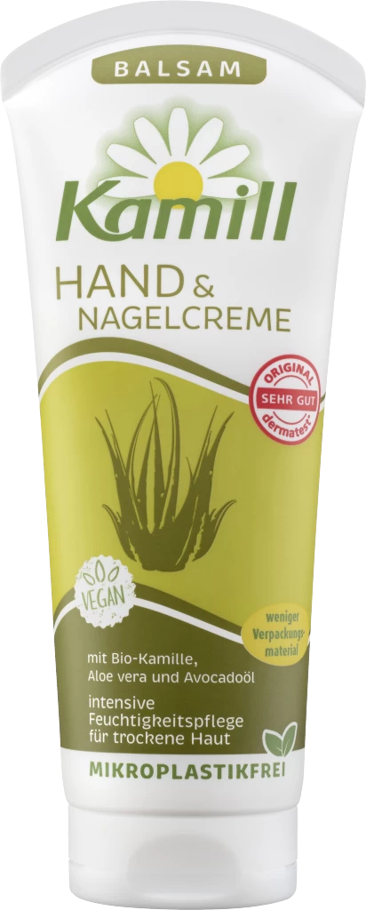 Die intensive Handpflege für trockene Haut bietet Schutz, Regeneration und ist besonders feuchtigkeitsspendend. Sie enthält Bio-Kamille*, Bisabolol, Aloe Vera und Avocadoöl.