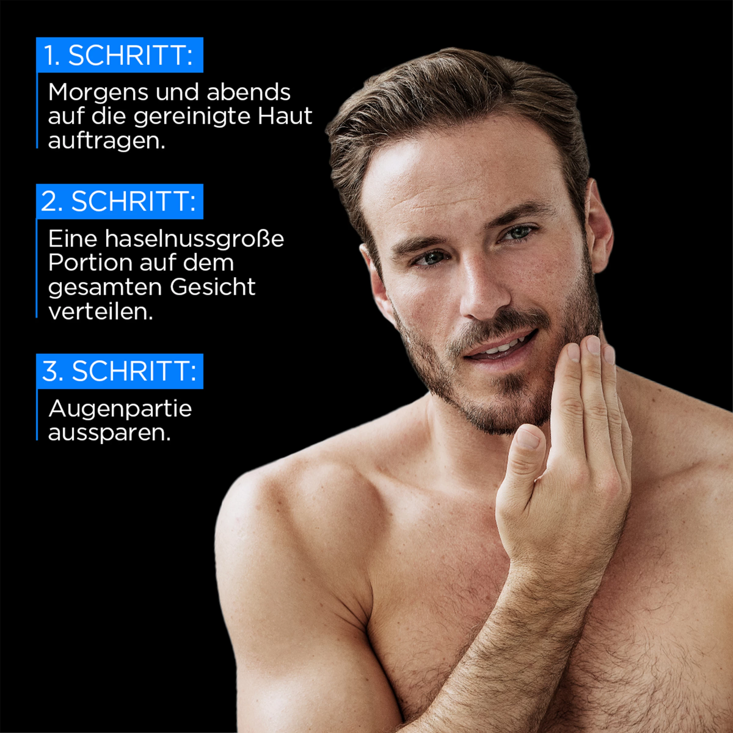 Morgens und/oder abends auf dem gesamten Gesicht verteilen. Die Formel beruhigt die Haut auch nach der Rasur.