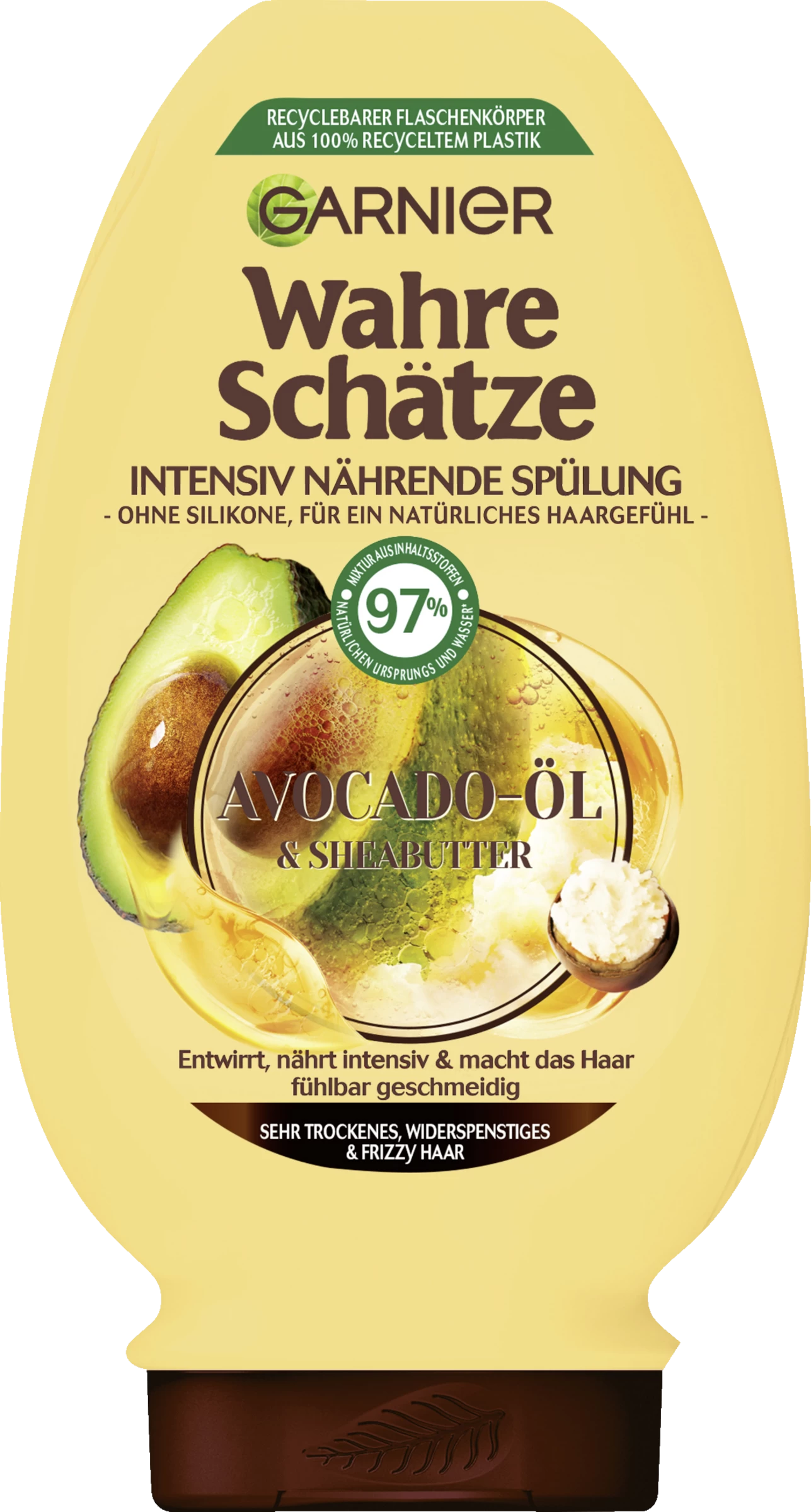 Garnier Wahre Schätze Intensiv Nährende Spülung Avocado-Öl & Sheabutter nährt sehr trockenes Haar intensiv und macht es geschmeidig. Die Haare erhalten einen gesunden Glanz und sind leichter kämmbar.