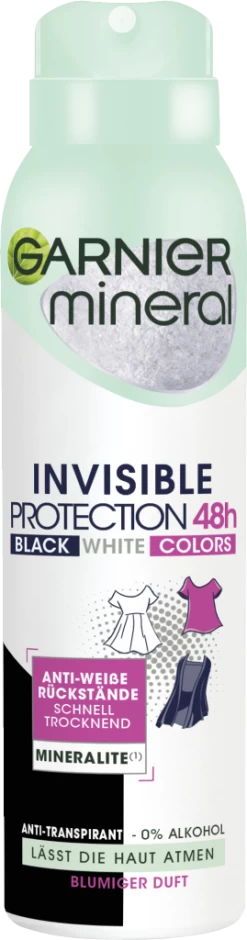Das Garnier Mineral Invisible Black, White Colors Spray sorgt für einen 48 h-Deo-Schutz und verhindert, dass sich Deo-Flecken auf der Kleidung absetzen. Gleichzeitig bietet das Anti-Transpirant einen intensiven Schutz vor Achselnässe und Körpergeruch – bis zu 48 Stunden lang. Die Formel des Sprays ist mit Mineralite* angereichert. So entsteht ein sehr langanhaltender und starker Trocken-Effekt – für ein frisches, sauberes Hautgefühl. Garnier Mineral Invisible Black, White Colors Spray klebt nicht und fühlt sich dank der erfrischenden, feinen Textur angenehm auf der Haut an.