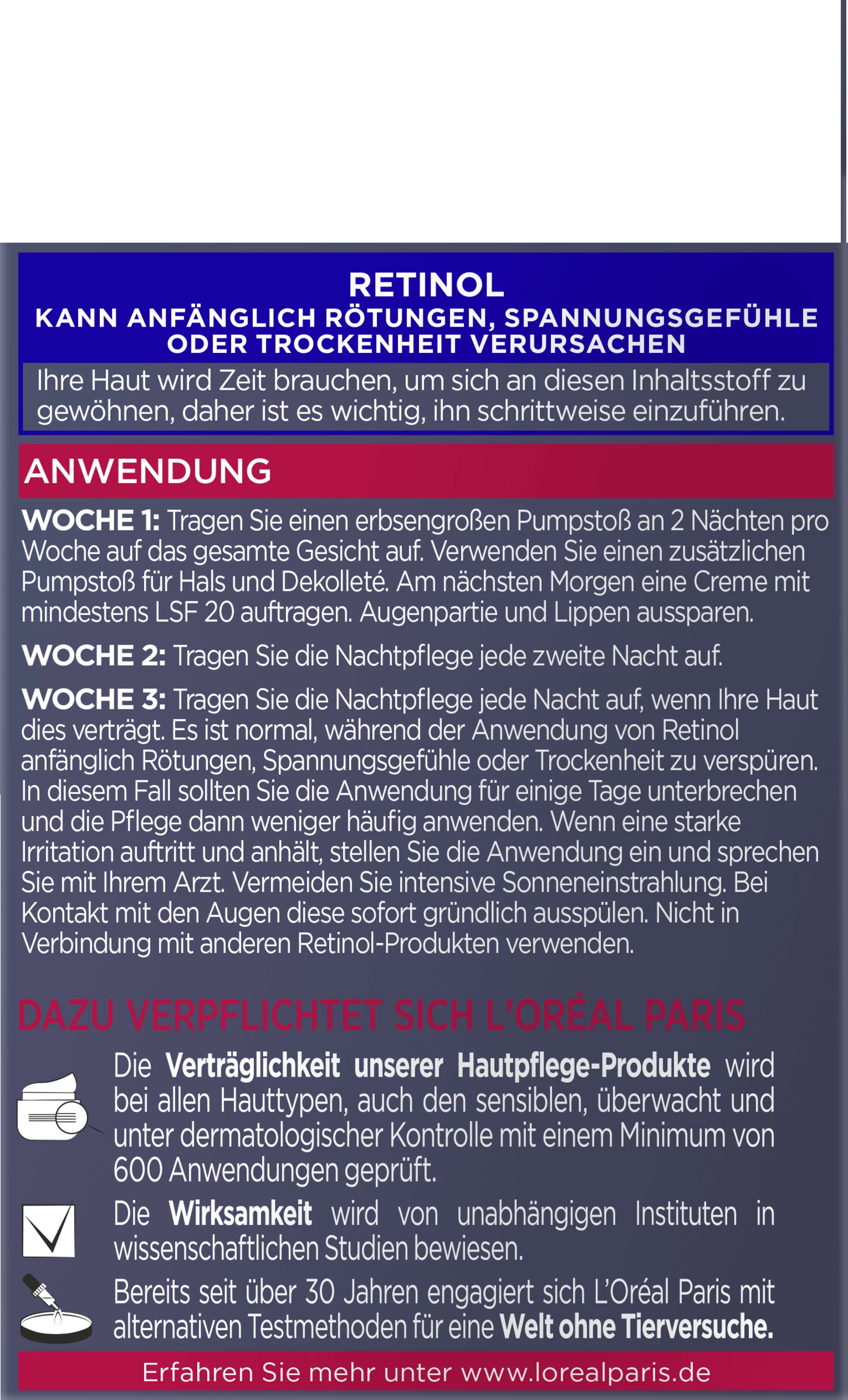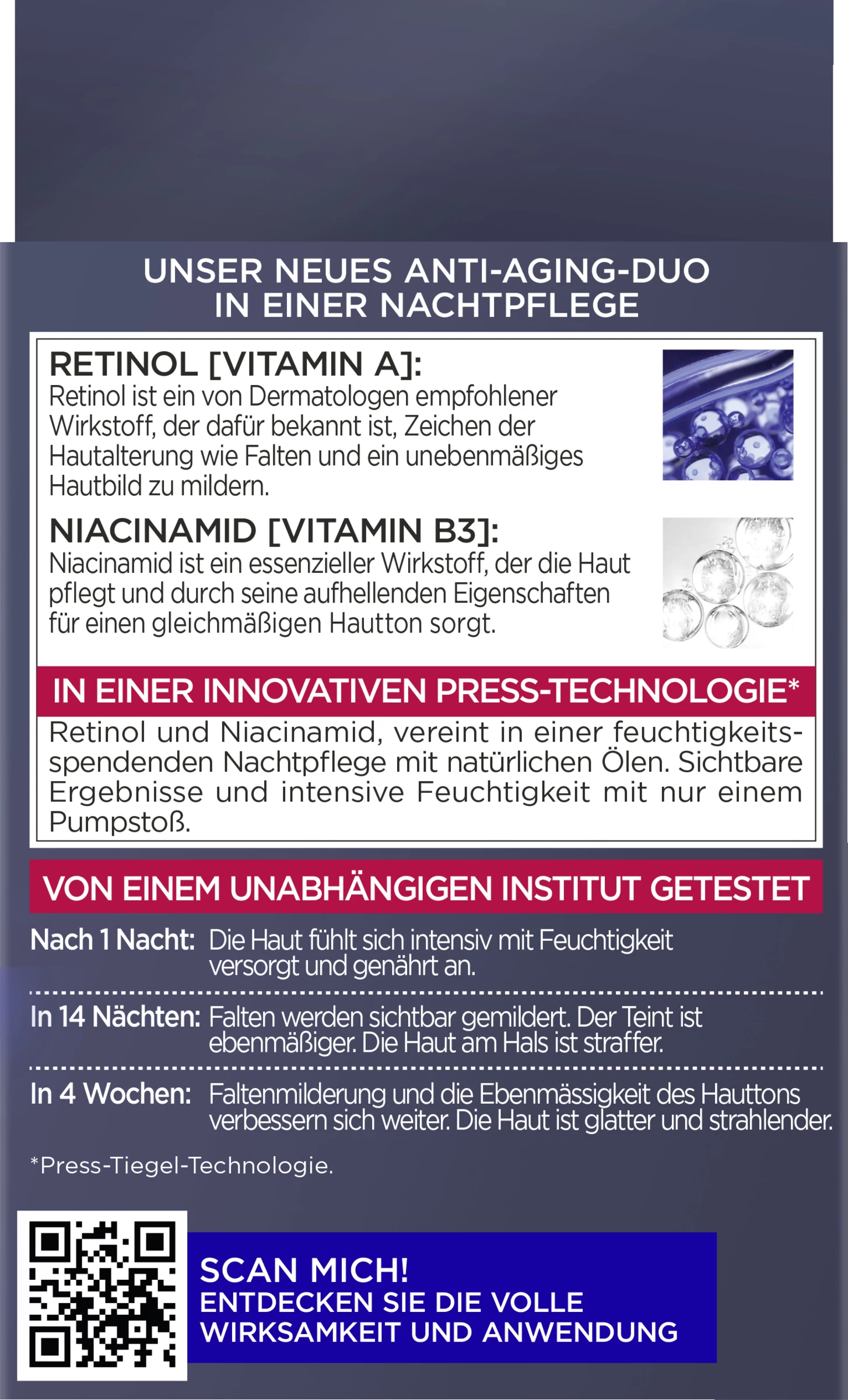 Die Revitalift Laser Gepresste Anti-Falten Pflege Nacht mit Retinol + Niacinamid von L’Oréal Paris mildert sichtbar Falten und korrigiert zugleich ein unebenmäßiges Hautbild. Dank enthaltenem Retinol [Vitamin A], ein von Dermatologen empfohlener Wirkstoff, wird den sichtbaren Anzeichen der Hautalterung effektiv entgegengewirkt. Niacinamid ist ein essenzieller Wirkstoff, der die Haut pflegt und durch seine aufhellenden Eigenschaften für einen gleichmäßigen Hautton sorgt. Die innovative Press-Tiegel-Technologie sorgt für eine hygienische Anwendung und leichte Dosierung. Nach einer Nacht fühlt sich die Haut intensiv mit Feuchtigkeit versorgt und genährt an. Nach 14 Nächten werden Falten sichtbar gemildert. Der Teint ist ebenmäßiger. Die Haut am Hals ist straffer. In 4 Wochen verbessern sich die Faltenmilderung und die Ebenmäßigkeit des Hauttons weiter. Die Haut ist glatter und strahlender.