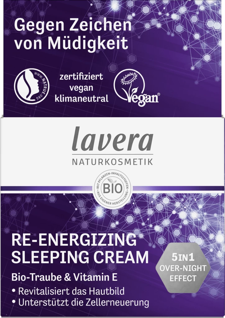 Erlebe das lavera Gefühl natürlich schöner Haut über Nacht: Während wir schlafen, arbeiten unsere Hautzellen auf Hochtouren, um die Spuren des Tages zu reparieren. Die Re-Energizing Sleeping Cream von lavera revitalisiert das Hautbild und unterstützt die natürliche Zellerneuerung in der Nacht. Die seidige Textur mit erlesenen Power-Wirkstoffen spendet der Haut intensive Feuchtigkeit – für eine frische und strahlend schöne Haut am Morgen.
