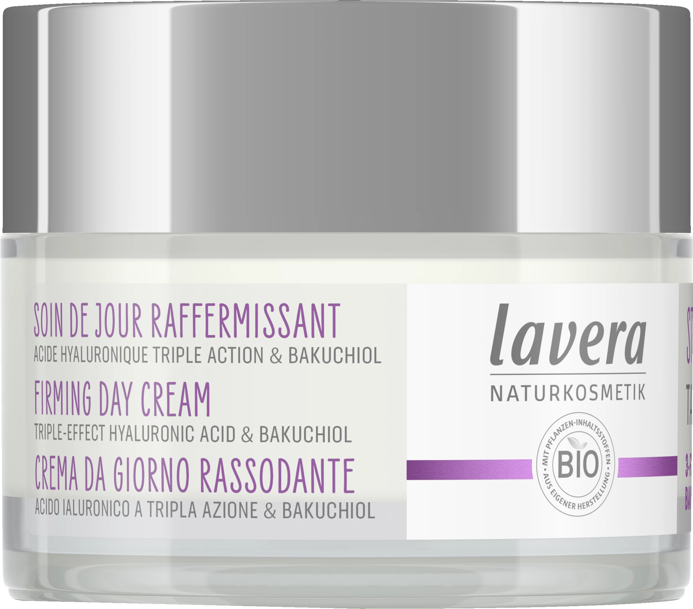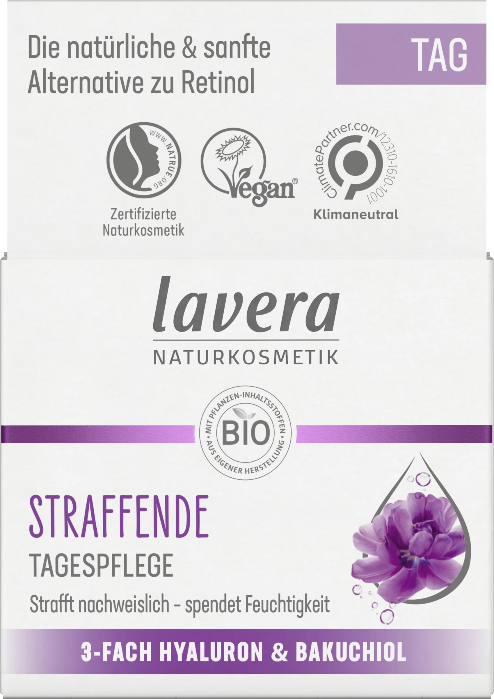 Erlebe das lavera Gefühl spürbar strafferer Haut. Die straffende Tagespflege mit 3-fach-Hyaluron & und dem Power-Wirkstoff Bakuchiol wirkt dem Alterungsprozess der Haut auf natürliche Weise entgegen. Die hochwirksame und gut verträgliche Formel stimuliert nachweislich das hauteigene Kollagensystem und mindert Falten. Spüre, wie die schnell einziehende Textur sanft mit deiner Haut verschmilzt und ihr dabei intensive Feuchtigkeit und Pflege schenkt – für ein strafferes, frisches und ebenmäßiges Hautbild.