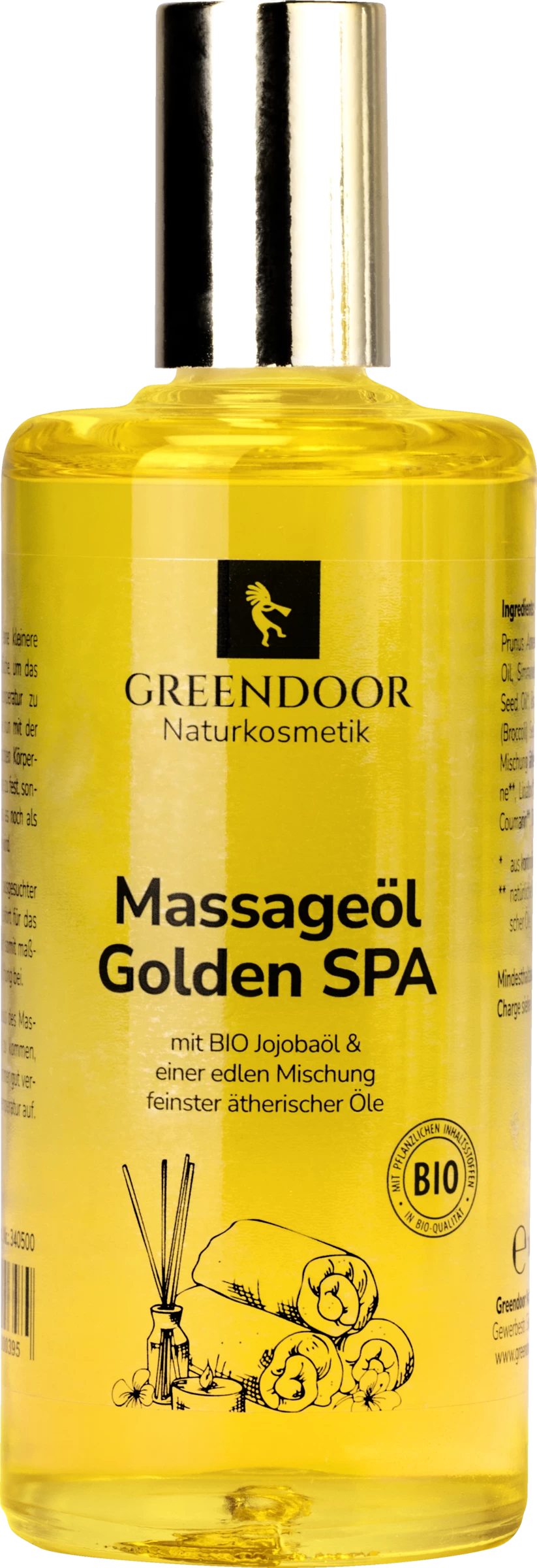 GREENDOOR Massageöl Golden SPA: ein wundervolles, edles Massageöl aus BIO Jojobaöl, Aprikosenkernöl und BIO Brokkolisamenöl sowie einer Mischung verschiedener geheimnisvoller reiner ätherischer Öle. GREENDOOR Massageöl Golden SPA – zu 100% natürlich – ohne Paraffin, ohne Zusatzstoffe, ohne synthetische Düfte. Ein wunderbar goldgelbes Öl mit extrem zarter Textur. Auf der Haut sorgt es für einen hervorragenden seidigen Gleiteffekt. Der Duft ist perfekt ausbalanciert und wunderbar entspannend: einfach wohlfühlen und genießen