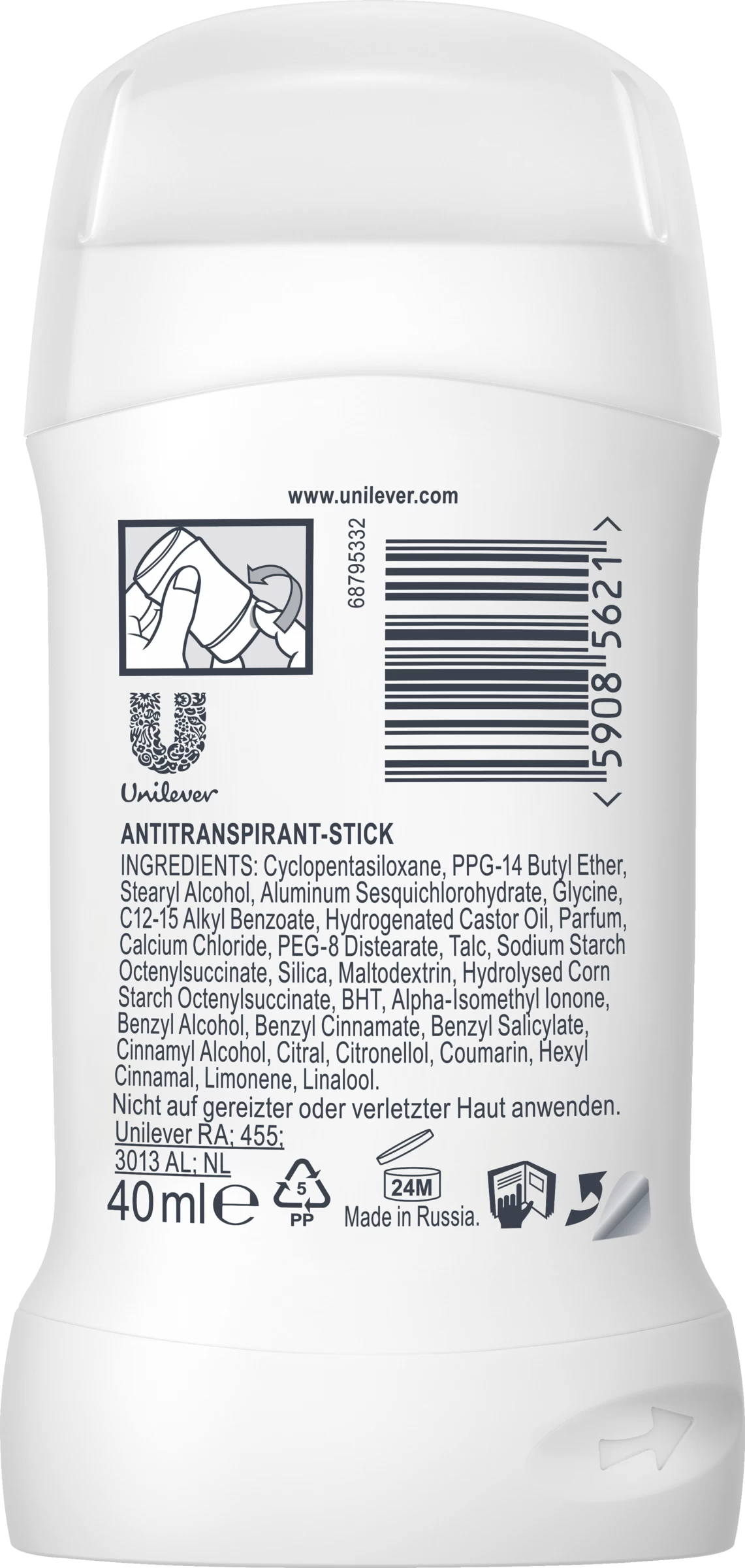 Cyclopentasiloxane, PPG-14 Butyl Ether, Stearyl Alcohol, Aluminum Sesquichlorohydrate, Glycine, C12-15 Alkyl Benzoate, Hydrogenated Castor Oil, Parfum, Calcium Chloride, PEG-8 Distearate, Talc, Sodium Starch Octenylsuccinate, Silica, Maltodextrin, Hydrolysed Corn Starch Octenylsuccinate, BHT, Alpha-Isomethyl Ionone, Benzyl Alcohol, Benzyl Cinnamate, Benzyl Salicylate, Cinnamyl Alcohol, Citral, Citronellol, Coumarin, Hexyl Cinnamal, Limonene, Linalool.