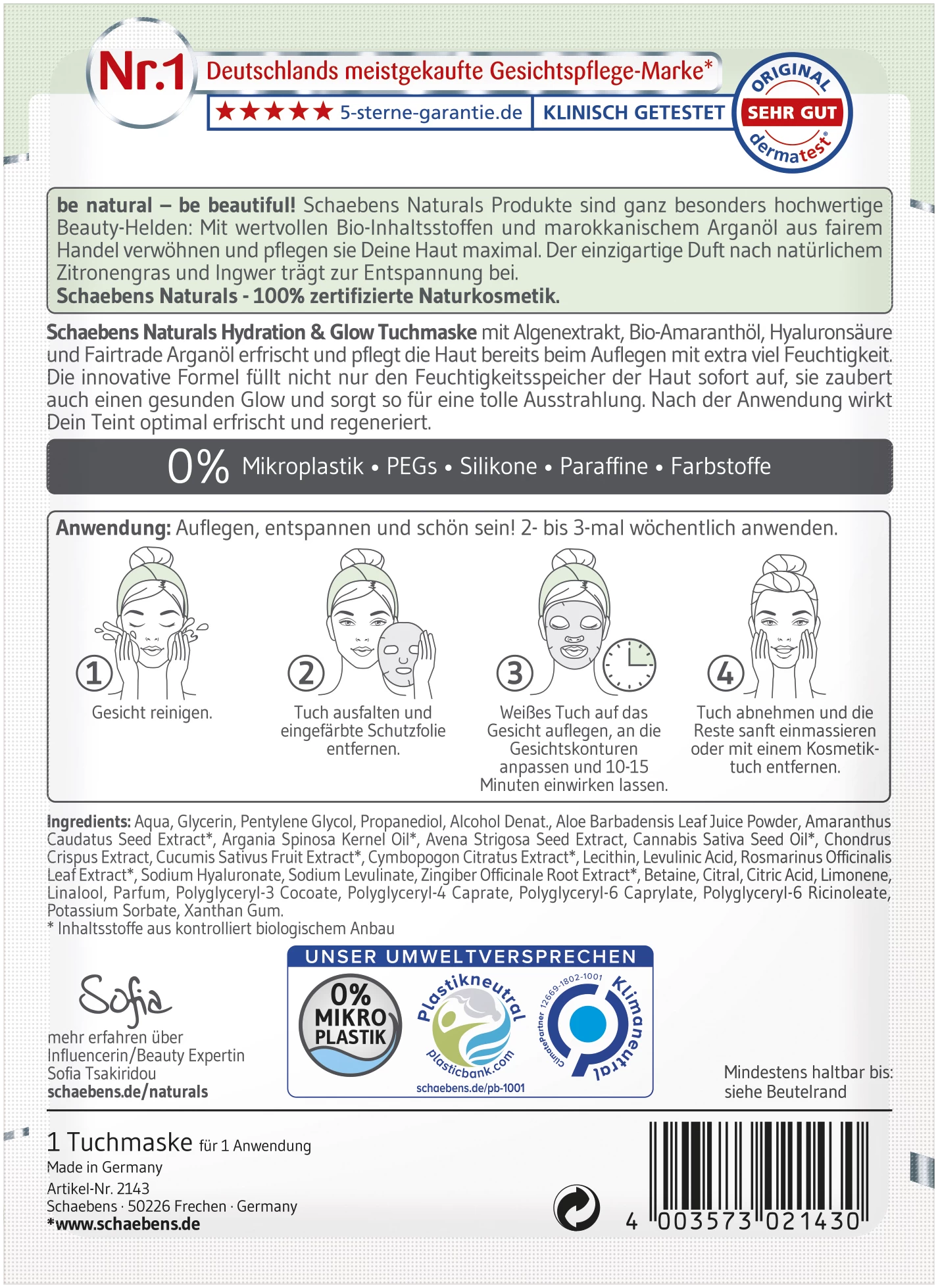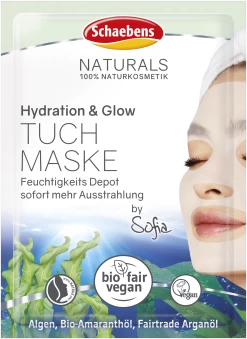Feuchtigkeits Depot sofort mehr Ausstrahlung. Schaebens Naturals Hydration & Glow Tuchmaske mit Algenextrakt, Bio-Amaranthöl, Hyaluronsäure und Fairtrade Arganöl erfrischt und pflegt die Haut bereits beim Auflegen mit extra viel Feuchtigkeit. Die innovative Formel füllt nicht nur den Feuchtigkeitsspeicher der Haut sofort auf, sie zaubert auch einen gesunden Glow und sorgt so für eine tolle Ausstrahlung. Nach der Anwendung wirkt Dein Teint optimal erfrischt und regeneriert.