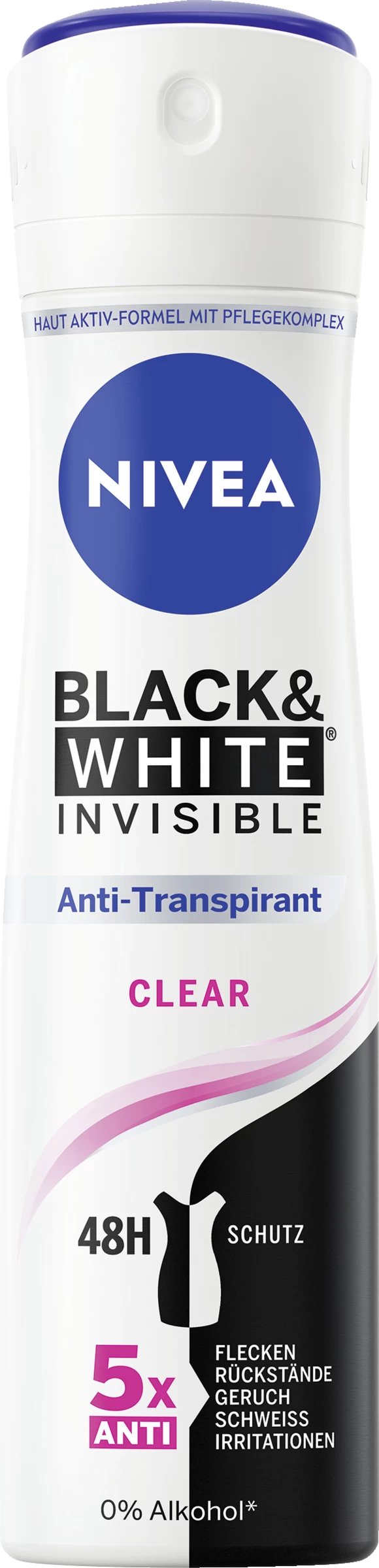 NIVEA Black & White Invisible Clear bietet einen Anti-Transpirant-Schutz vor Achselnässe und Körpergeruch – 48 Stunden lang. Die hochwirksame Formel schützt vor gelben Flecken auf weißer Kleidung und weißen Rückständen auf dunklen Textilien und ist nun als Light-Weight Can in einer nachhaltigeren Dose verfügbar. Für Deo-Schutz, den man nicht sieht, aber fühlt.