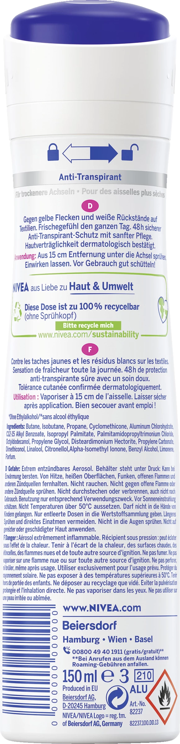 Extrem entzündbares Aerosol. Behälter steht unter Druck: Kann bei Erwärmung bersten. Von Hitze, heißen Oberflächen, Funken, offenen Flammen und anderen Zündquellen fernhalten. Nicht rauchen. Nicht gegen offene Flamme oder andere Zündquelle sprühen. Nicht in die Augen sprühen. Nicht auf gereizter oder geschädigter Haut anwenden. Nicht durchstechen oder verbrennen, auch nicht nach Gebrauch. Benutzung nur entsprechend Verwendungszweck. Vor Sonnenbestrahlung schützen. Nicht Temperaturen über 50°C aussetzen. Darf nicht in die Hände von Kindern gelangen. Nur entleerte Dosen in die Wertstoffsammlung geben.