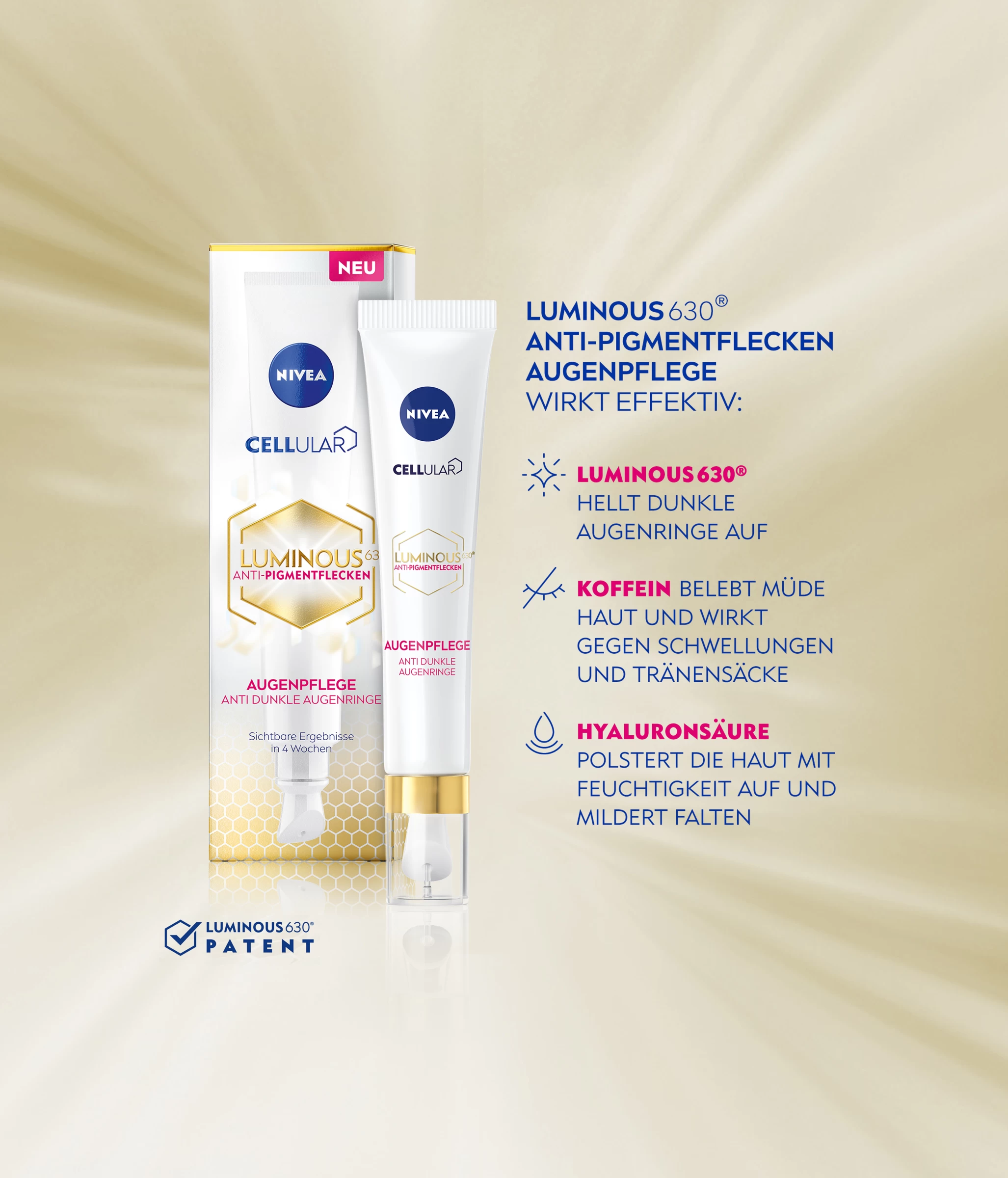 ach 10 Jahren intensiver Forschung und der Prüfung von mehr als 50.000 Inhaltsstoffen hat NIVEA einen neuen, hocheffektiven Wirkstoff für die Reduzierung von Pigmentflecken entwickelt: LUMINOUS630®. Die innovative Luminous630® ANTI-PIGMENTFLECKEN Augenspflege wirkt effektiv gegen 3 Ursachen von dunklen Augenringen und Augenschatten. Die Formel mit