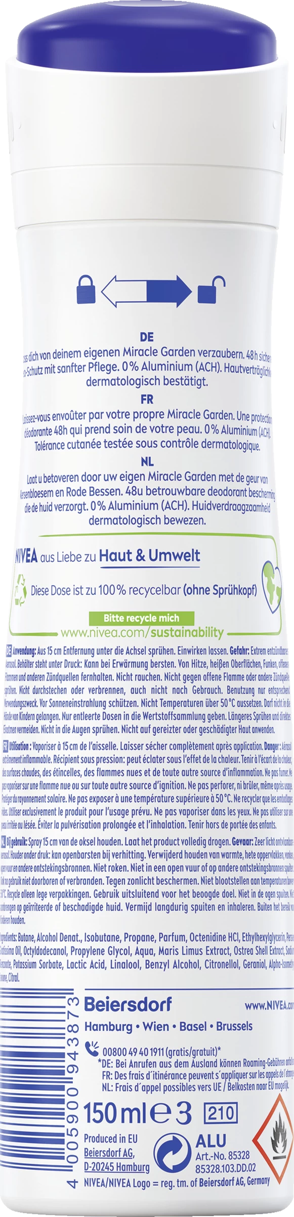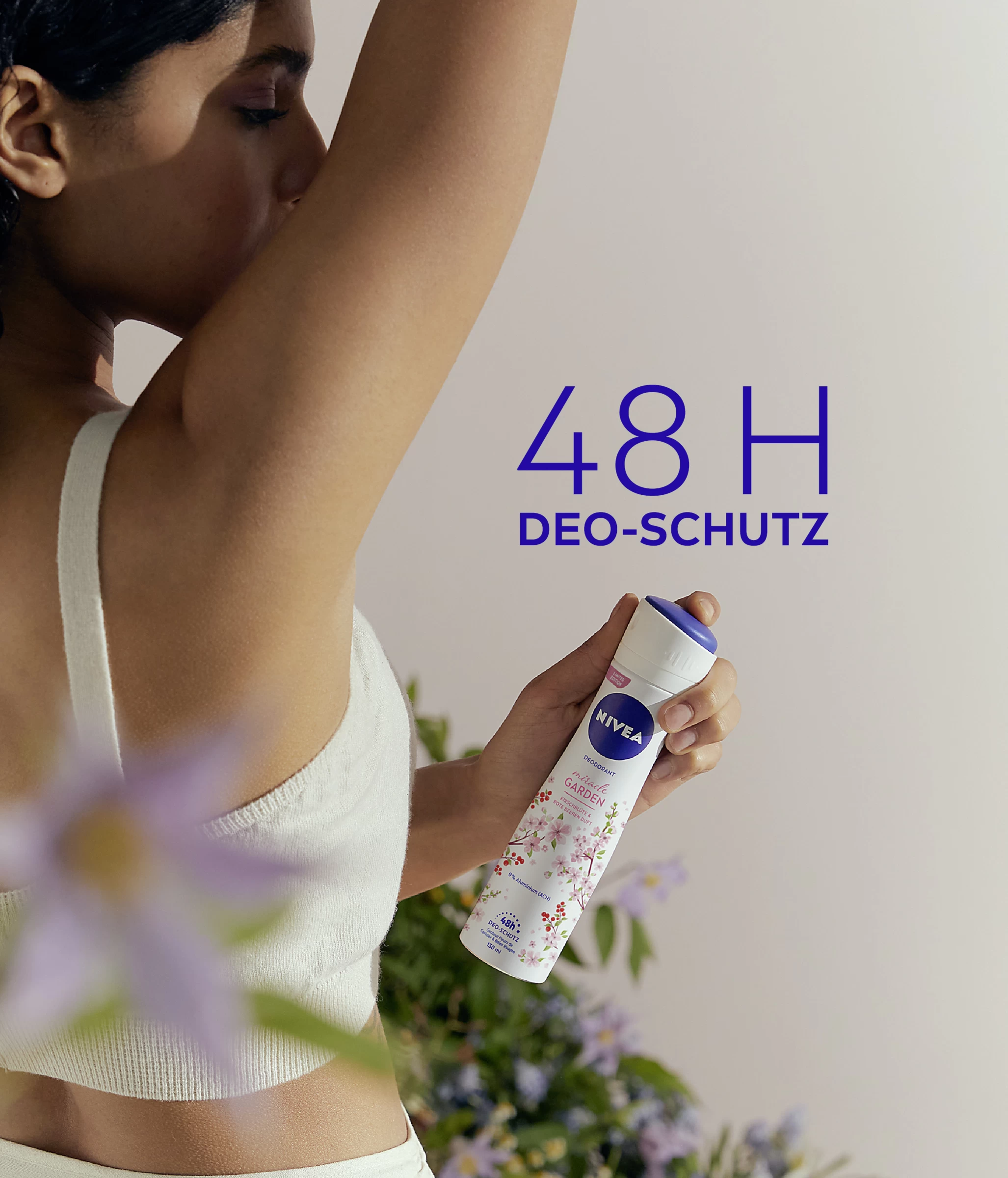 Das NIVEA Miracle Garden Kirschblüte Deo Spray gibt dir ein trockenes und frisches Hautgefühl mit dem Duft nach Kirschblüte & rote Beeren. Das Produkt bietet einen effektiven und sicheren Schutz ohne Aluminium (ACH) – und das 48 Stunden lang. Die Limited Edition sorgt mit der sanften Formel für langanhaltende Pflege und verleiht einen frischen, blumigen Duft. Die Hautverträglichkeit ist dermatologisch bestätigt. Nimm dir einen Moment für dich selbst: NIVEA Miracle Garden Kirschblüte Deo Spray.