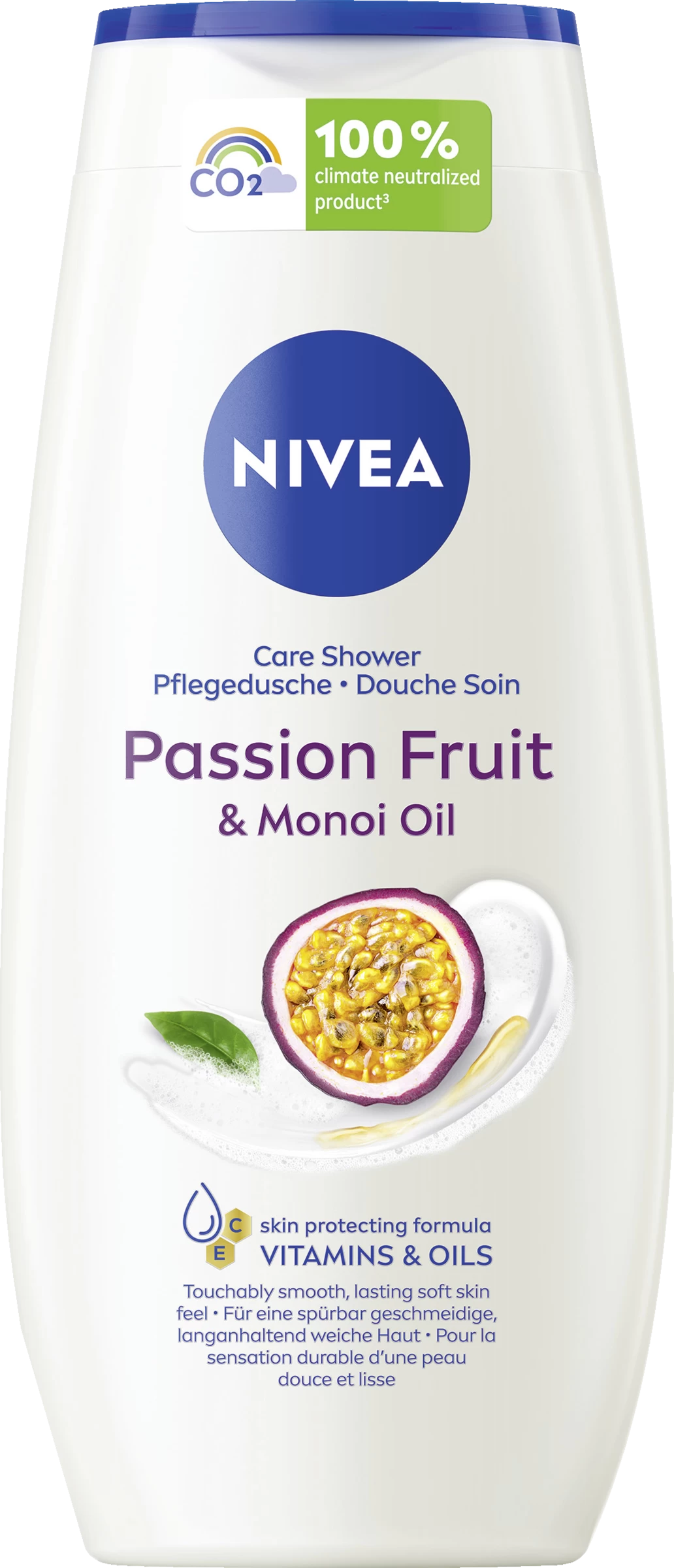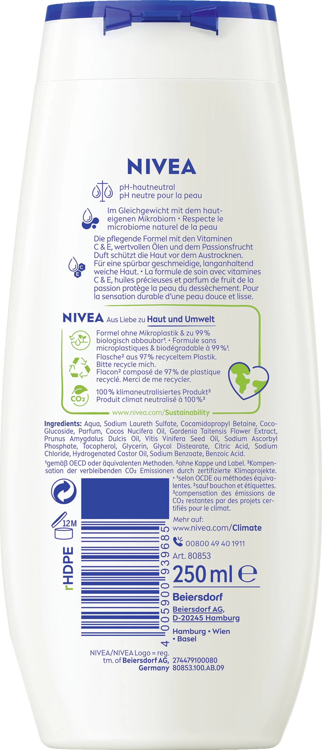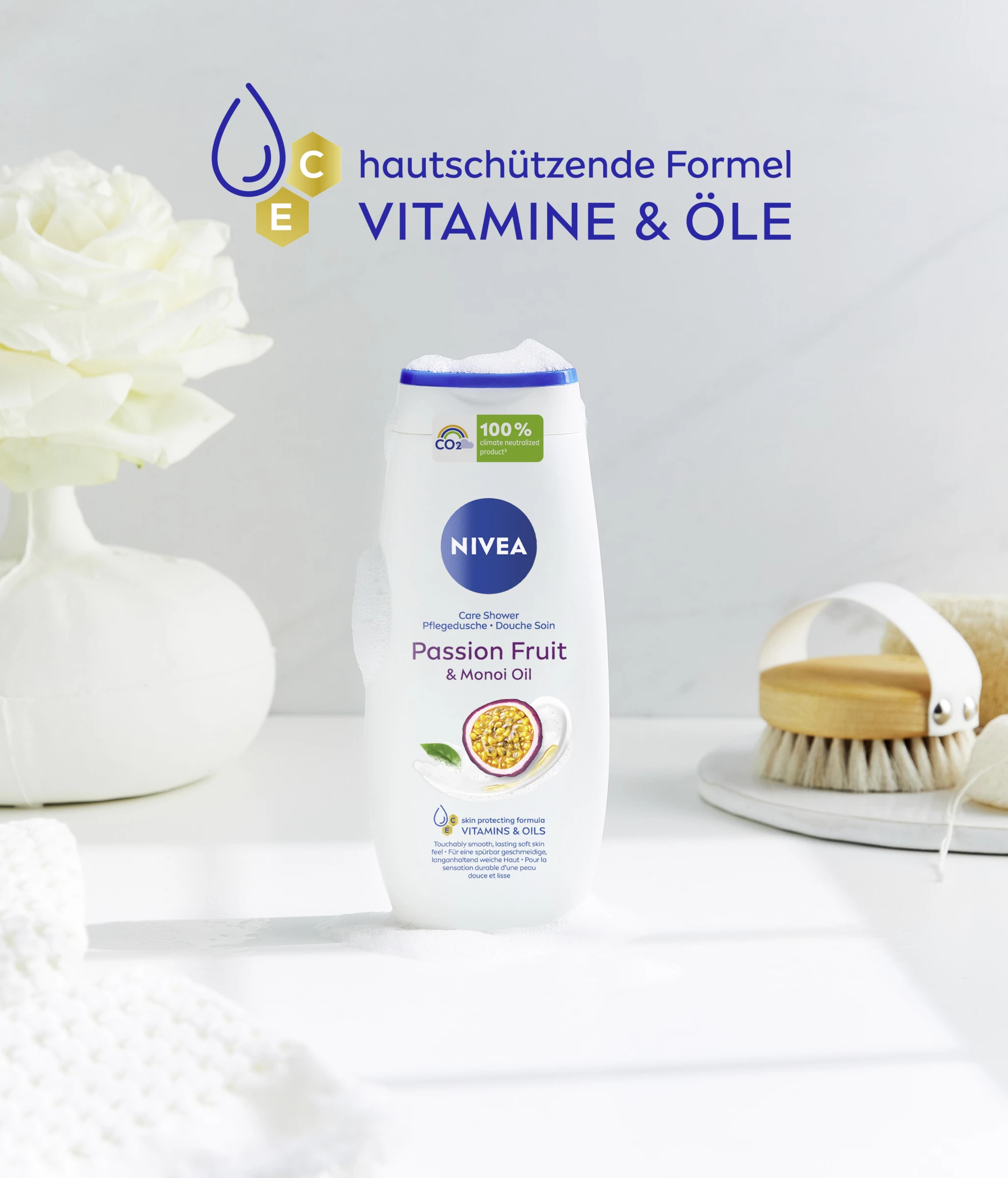 Entdecken Sie ein verwöhnendes Duscherlebnis mit dem cremigen NIVEA Passion Fruit Duschgel. Spüren Sie, wie die seidige Cremedusche Ihre Haut sanft reinigt und ihr dank der Formel mit wertvollem Ölen, Monoi-Öl und Vitamin C & E sanfte Pflege spendet. Genießen Sie den samtweichen Schaum auf Ihrer Haut und den zarten Passion Fruit-Duft, der Ihre Sinne verwöhnt. Dieses Duschgel tut sowohl Ihrer Haut als auch der Umwelt etwas Gutes. Die Formel enthält keine festen Mikroplastik-Partikel und ist zu 98% biologisch abbaubar. Außerdem besteht die Flasche aus 97% Recycling-Material, ohne Label und Verschlusskappe. Für ein geschmeidiges Hautgefühl: NIVEA Pflegedusche Passion Fruit.