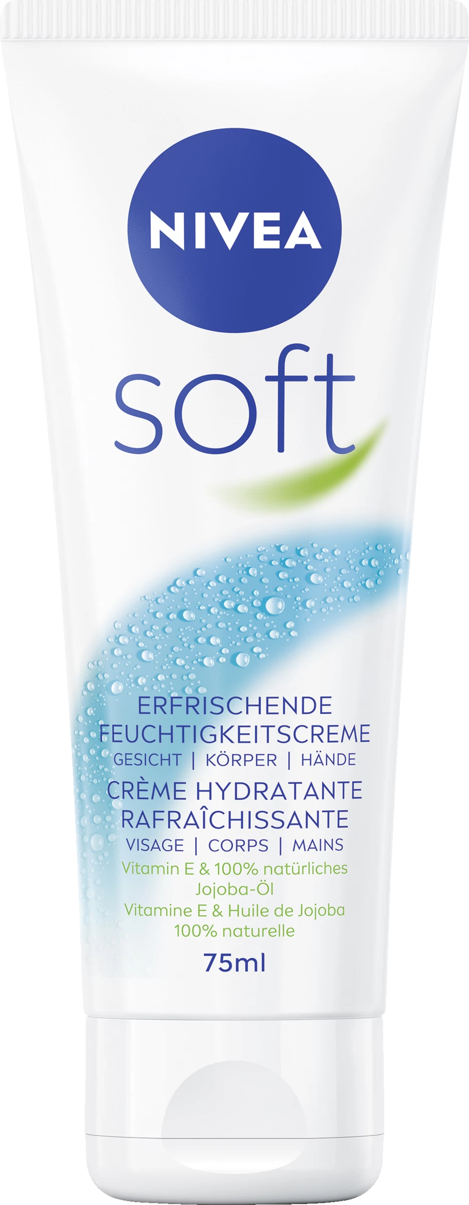 Die Nivea Soft erfrischende Feuchtigkeitscreme verleiht Ihrer Haut einen belebenden Frische-Kick und ist für die tägliche Anwendung geeignet. Die leichte Formel mit Vitamin E und 100% natürlichem Jojoba-Öl spendet Ihrer Haut 48h intensive Feuchtigkeit, zieht schnell ein und klebt nicht. Ihre Haut ist fühlbar entspannter, erfrischter und weicher. Jetzt testen: Nivea Soft Tube 75ml. 100% klimaneutralisiertes Produkt*.