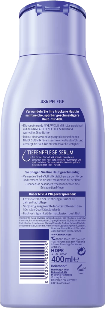 Für alle, die mehr als nur Feuchtigkeit von einer Body Lotion erwarten. Die NIVEA Verwöhnende Soft Milk bietet 3 in 1: 48h Pflege, Geschmeidigkeit und natürlich schöne Haut. Sie ist angereichert mit dem NIVEA TIEFENPFLEGE SERUM und wertvoller Shea-Butter, für verwöhnte, geschmeidige Haut. Mit nur einer Anwendung sorgt sie für ein samtweiches Hautgefühl und versorgt die Haut 48h mit intensiver Feuchtigkeit. Für einen Effekt den Sie nicht nur fühlen, sondern auch sehen können: NIVEA Verwöhnende Soft Milk.