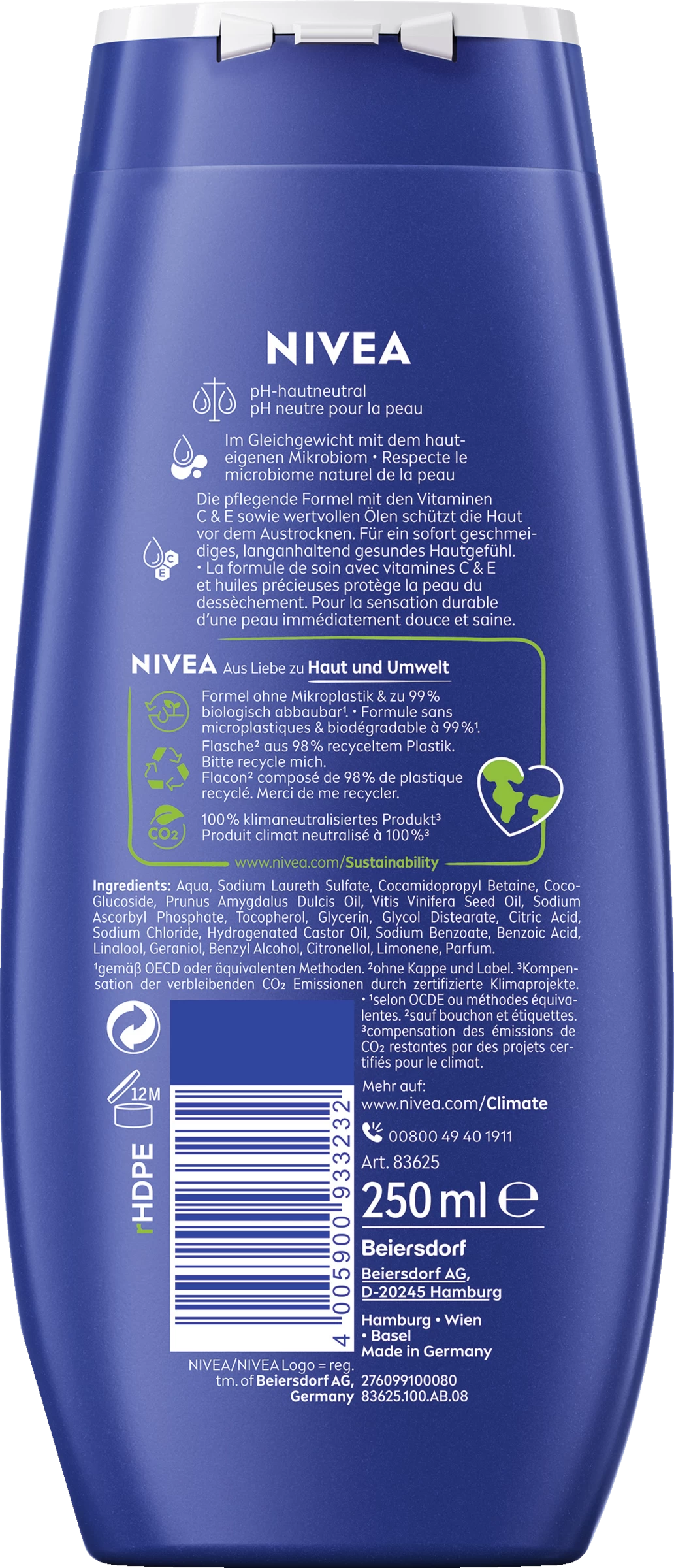 Spüren Sie, wie die NIVEA Creme Care Pflegedusche Ihre Haut unter der Dusche sanft reinigt und pflegt. Dank der Formel mit ausgesuchten Inhaltsstoffen der NIVEA Creme, angereichert mit Vitamine C & E und wertvollen Ölen spendet das seidige Duschgel Ihnen ein geschmeidiges Hautgefühl. Genießen Sie den samtweichen Schaum und den einzigartigen milden Duft. Dieses Duschgel ist zu 100% klimaneutralisiert und tut damit nicht nur Ihrer Haut, sondern auch der Umwelt etwas Gutes. Die Formel ist zu 99% biologisch abbaubar und enthält kein Mikroplastik. Die Flasche besteht zu 98% aus Recycling-Material, ohne Verschluss und Label. Verwandeln Sie jedes Duscherlebnis in einen verwöhnenden Pflegemoment mit NIVEA: Creme Care Pflegedusche.