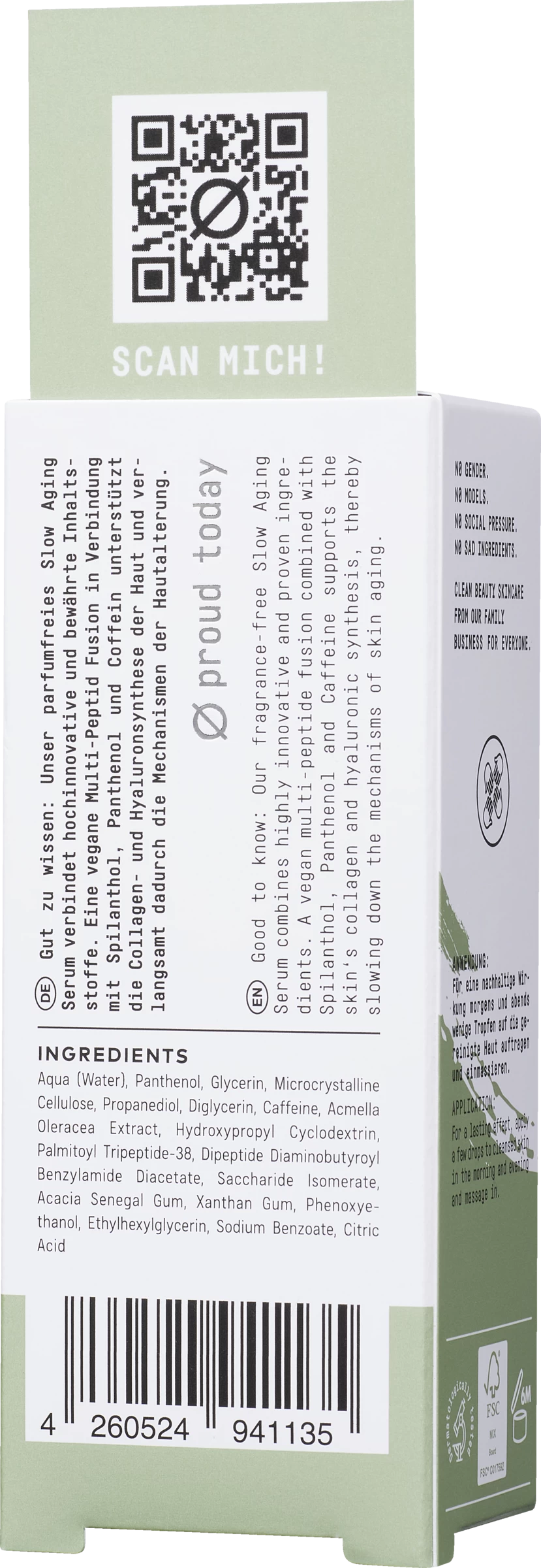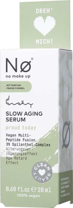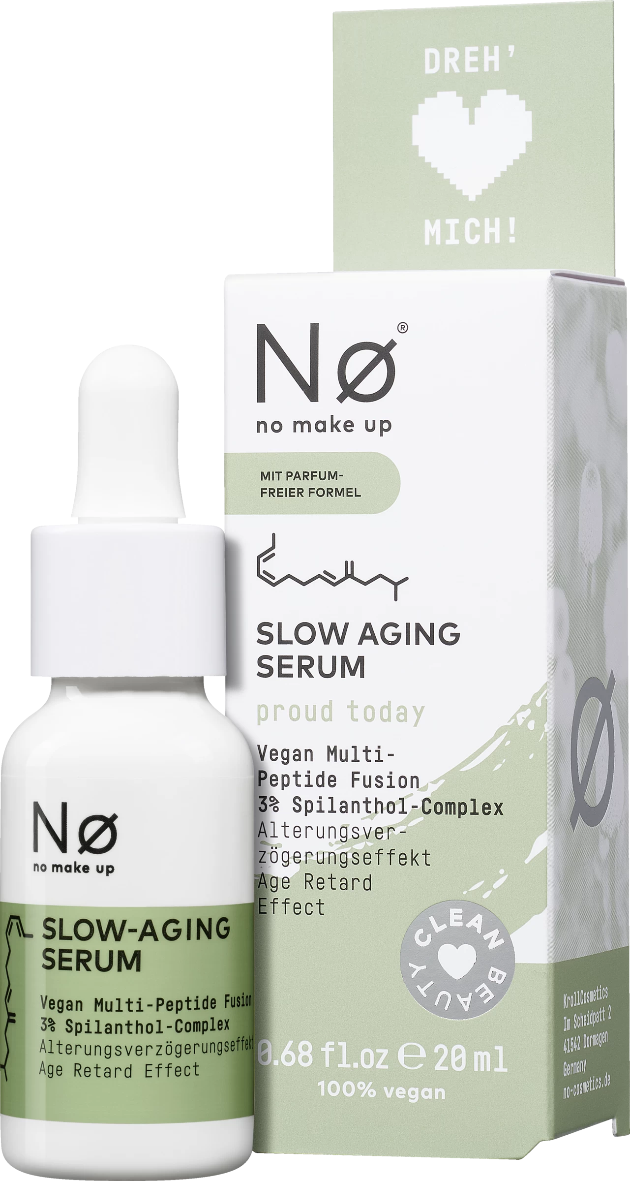 Anti Aging war gestern – Say Hellø Tø Prøud Aging mit unserem Sløw Aging Serum! Eine vegane Multi-Peptid-Fusion – also eine Kombination aus hochwirksamen Peptidkomplexen – sowie einen 3-prozentigen Spilantholkomplex sorgen für eine in Studien nachgewiesene Wirksamkeit gegen Hautalterung und Mimikfältchen. Außerdem unterstützen enthaltenes 5 % Panthenol und 1 % Coffein die antioxidative Wirkung der Peptide. Ein mariner Wirkkomplex unterstützt außerdem die Vaskularisation der Haut für einen „Natural-Rouge-Effekt“. Pflegendes Slow Aging Serum gegen erste Anzeichen der Hautalterung. Enthält Spilanthol, Panthenol & Coffein.