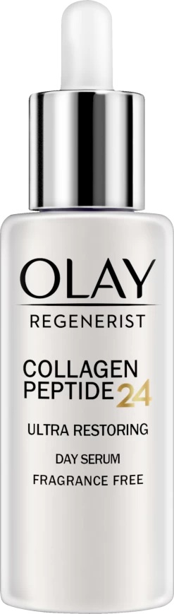 Sichtbar starke und strahlende Haut in 14 Tagen mit dem Olay Regenerist Collagen Peptide24 Serum. Wussten Sie, dass Kollagen ein wesentlicher Bestandteil der Haut ist, der der Unterstützung Ihrer Hautstruktur dient? Mit zunehmendem Alter – etwa ab den Dreißigern – nimmt die Menge an Kollagen in der Haut ab, wodurch die Haut Anzeichen für Ermüdungserscheinungen aufweist. Das Collagen-Peptide24 Serum von Olay wird mit Kollagen-Peptiden angereichert, die im Gegensatz zu Kollagenmolekülen bis zu 10 Schichten tief in die Hautoberfläche eindringen können. Zusammen mit Vitamin B3 wirkt die Formel schnell, um Ihre Haut 24 Stunden lang intensiv zu hydratisieren, und hilft im Lauf der Zeit dabei, die Hautstruktur zu glätten und ihre Schutzbarriere wiederherzustellen – für starke und strahlende Haut. Das Collagen Peptide24 Serum zieht schnell in die Haut ein und hinterlässt ein nicht-fettendes Gefühl. Es ist parfümfrei und frei von Farbstoffen. Verwenden Sie das Olay Collagen Peptide24 Serum 28 Tage lang und sehen Sie, wie sich Ihre Haut verwandelt. Das Olay Collagen Peptide24 Serum ist für die tägliche Anwendung geeignet.