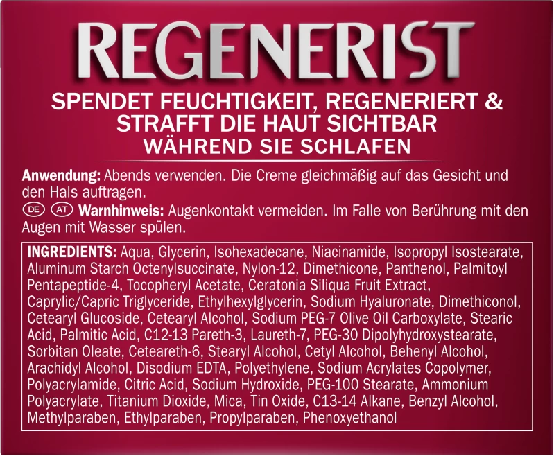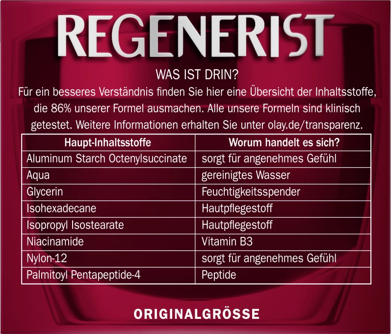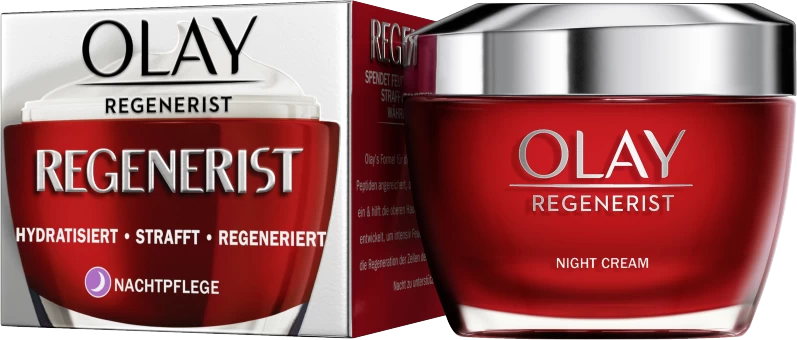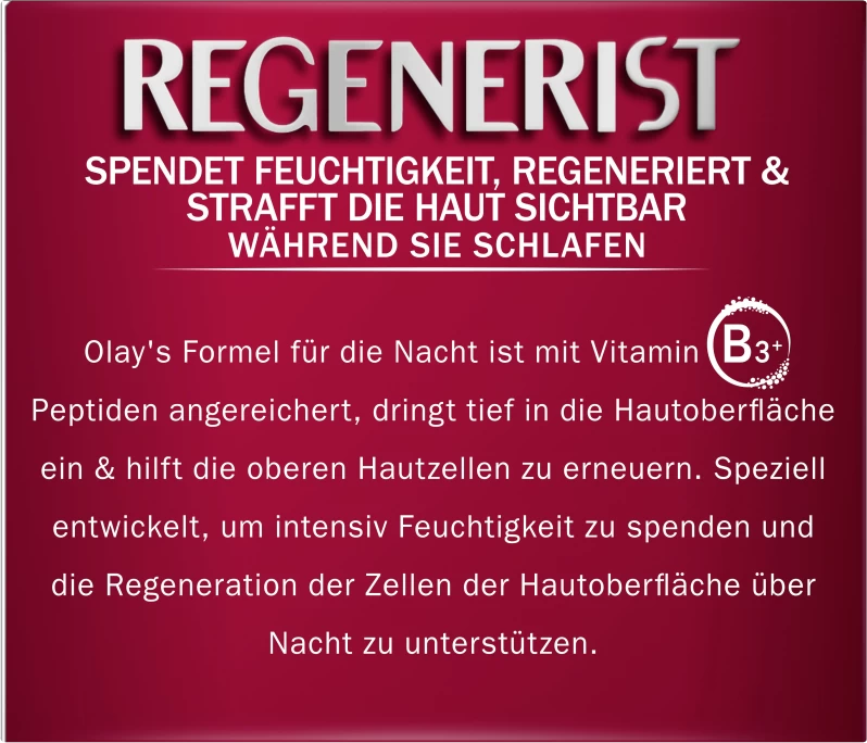 Erwachen Sie mit intensiv gepflegter, straffer und jünger-aussehender Haut mit der Olay Regenerist Nachtcreme. Angereichert mit Vitamin B3 (Niacinamid) und Peptiden, dringt die feuchtigkeitsbindende Formel bis zu 10 Schichten tief in die Hautoberfläche ein und hilft, die Zellerneuerung der oberen Hautschicht zu optimieren. Speziell entwickelt, um intensive Feuchtigkeit zu spenden und die Zellerneuerung der oberen Hautschicht bei Nacht zu fördern. Die Olay Regenerist Nachtcreme ist frei von Parfüm. Die feuchtigkeitsspendende Gesichtscreme für die Nacht eignet sich für alle Hauttypen (normale, trockene und fettige Haut). Verwenden Sie die Olay Regenerist Nachtcreme täglich für 28 Tage und sehen Sie, wie sich Ihre Haut verwandelt.