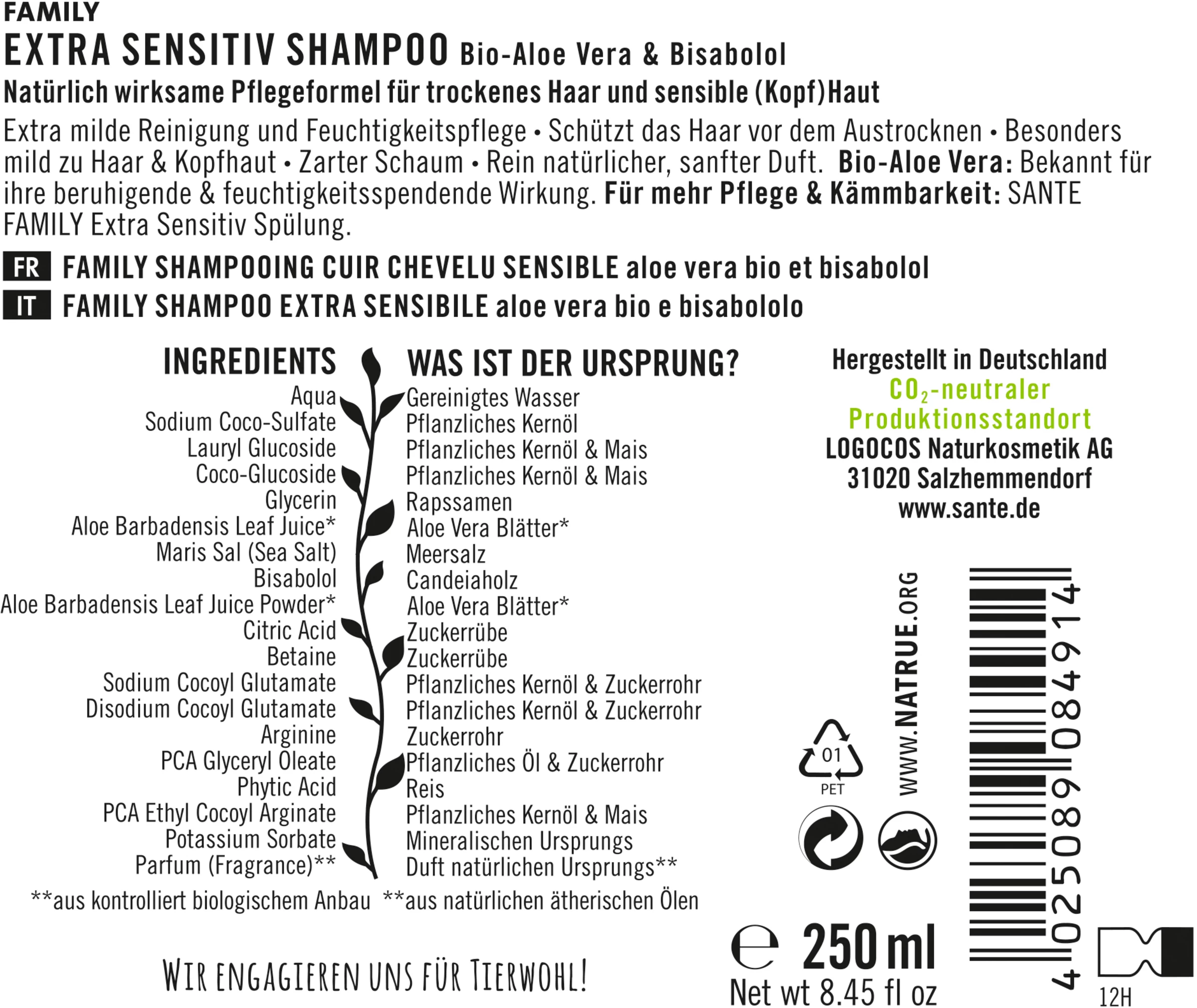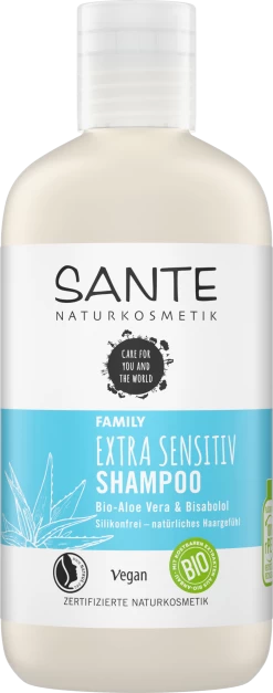 Das SANTE FAMILY Extra Sensitiv Shampoo mit Bio-Aloe Vera für trockenes Haar und sensible (Kopf)Haut reinigt besonders mild. Die natürlich wirksame Pflegeformel versorgt das Haar mit Feuchtigkeit und schützt es vor dem Austrocknen. Während der Haarwäsche entsteht ein zarter Schaum. Mit rein natürlichem, sanften Duft. Bio-Aloe Vera: Bekannt für ihre beruhigende & feuchtigkeitsspendende Wirkung.