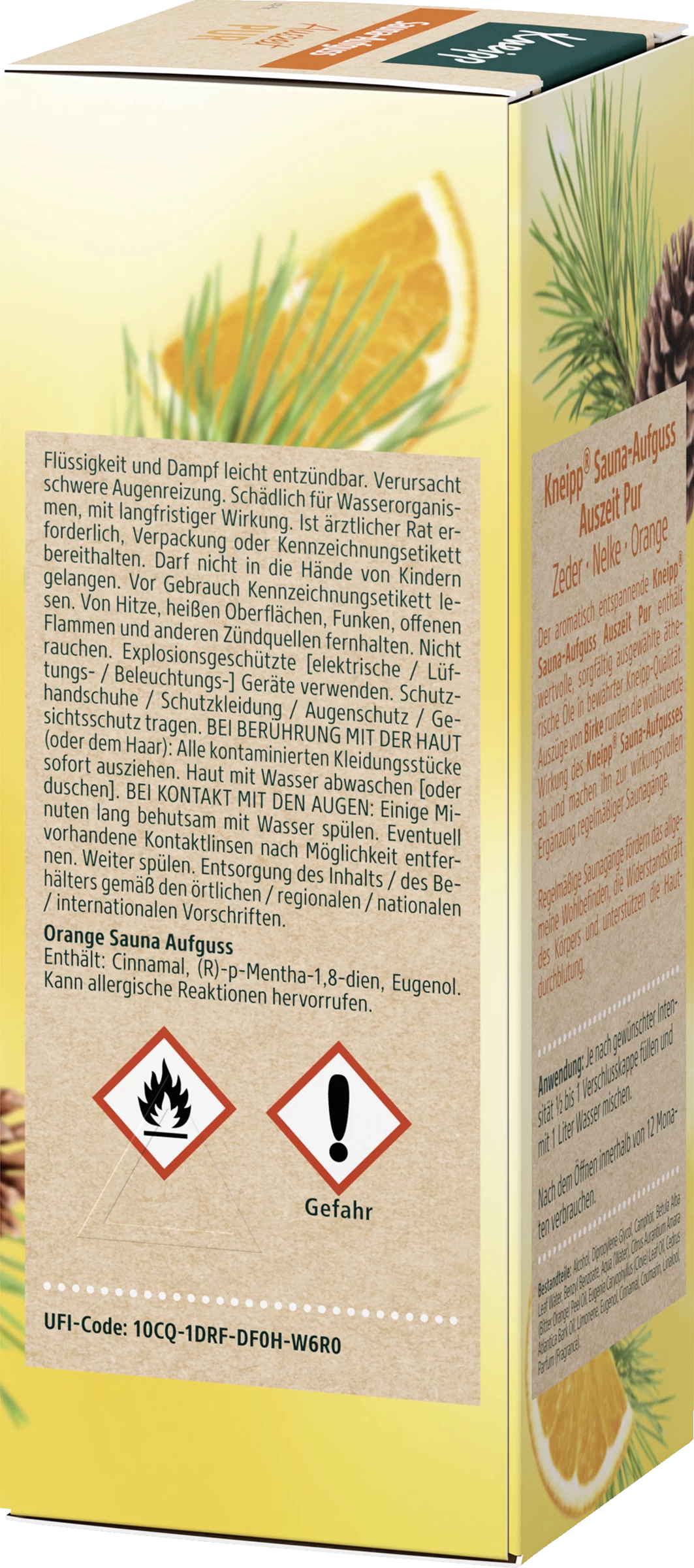 Flüssigkeit und Dampf leicht entzündbar. Verursacht schwere Augenreizungen. Schädlich für Wasserorganismen, mit langfristiger Wirkung. Ist ärztlicher Rat erforderlich, Verpackung oder Kennzeichnungsetikett bereithalten. Darf nicht in die Hände von Kindern gelangen. Vor Gebrauch Kennzeichnungsetikett lesen. Von Hitze, heißen Oberflächen, Funken, offenen Flammen und anderen Zündquellen fernhalten. Nicht rauchen. Explosionsgeschützte [elektrische / Lüftungs- / Beleuchtungs-] Geräte verwenden. Schutzhandschuhe / Schutzkleidung / Augenschutz / Gesichtsschutz tragen. BEI BERÜHRUNG MIT DER HAUT (oder dem Haar): Alle kontaminierten Kleidungsstücke sofort ausziehen. Haut mit Wasser abwaschen [oder duschen]. BEI KONTAKT MIT DEN AUGEN: Einige Mi- nuten lang behutsam mit Wasser spülen. Eventuell vorhandene Kontaktlinsen nach Möglichkeit entfer- nen. Weiter spülen. Entsorgung des Inhalts / des Be- hälters gemäß den örtlichen / regionalen / nationalen / internationalen Vorschriften. Orange Sauna Aufguss Enthält: Cinnamal, (R)-p-Mentha-1,8-dien, Eugenol. Kann allergische Reaktionen hervorrufen.