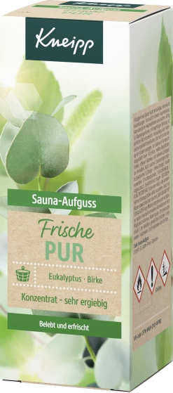Der frisch herbe Kneipp® Sauna-Aufguss Frische Pur enthält wertvolles, sorgfältig ausgewähltes ätherisches Eukalyptus-Öl in bewährter Kneipp-Qualität. Auszüge von Birke runden die wohltuende Wirkung des Kneipp® Sauna-Aufgusses ab und machen ihn zur wirkungsvollen Ergänzung regelmäßiger Saunagänge.