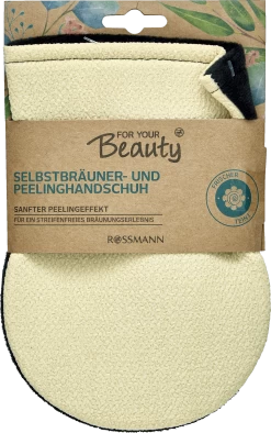 Der innovative for your Beauty Selbstbräuner- und Peelinghandschuh zeichnet sich durch zwei unterschiedliche Materialseiten aus. Die gröbere Peelingseite dient zur sanften Reinigung Ihrer Haut und bereitet diese perfekt auf das Bräunungsprodukt vor. Mit der weicheren Seite kann im zweiten Schritt optimal das Bräunungsprodukt in kreisenden Bewegungen aufgetragen und einmassiert werden.