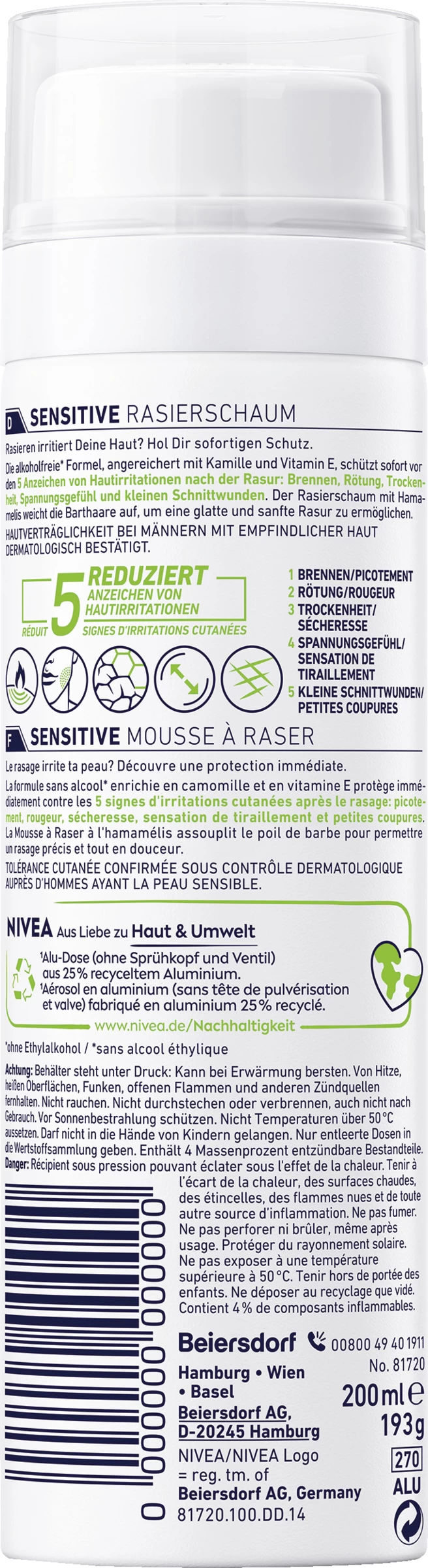 Bewahre Deine Haut vor Rasurstress: der Sensitive Rasierschaum sorgt für sofortigen Schutz und für eine sanfte Rasur. Die pflegende Formel beruhigt und entspannt intensiv mit der Unterstützung der Ultra Glide Technology, die für ein schonendes Gleiten der Klingen sorgt. Der Rasierschaum für sensible Haut schützt die Haut vor den Anzeichen von Hautirritationen nach der Rasur: Brennen, Rötung, Trockenheit, Spannungsgefühl und kleine Schnittverletzungen. Gönne Dir eine milde Rasur mit dem duftneutralen Sensitive Rasierschaum.