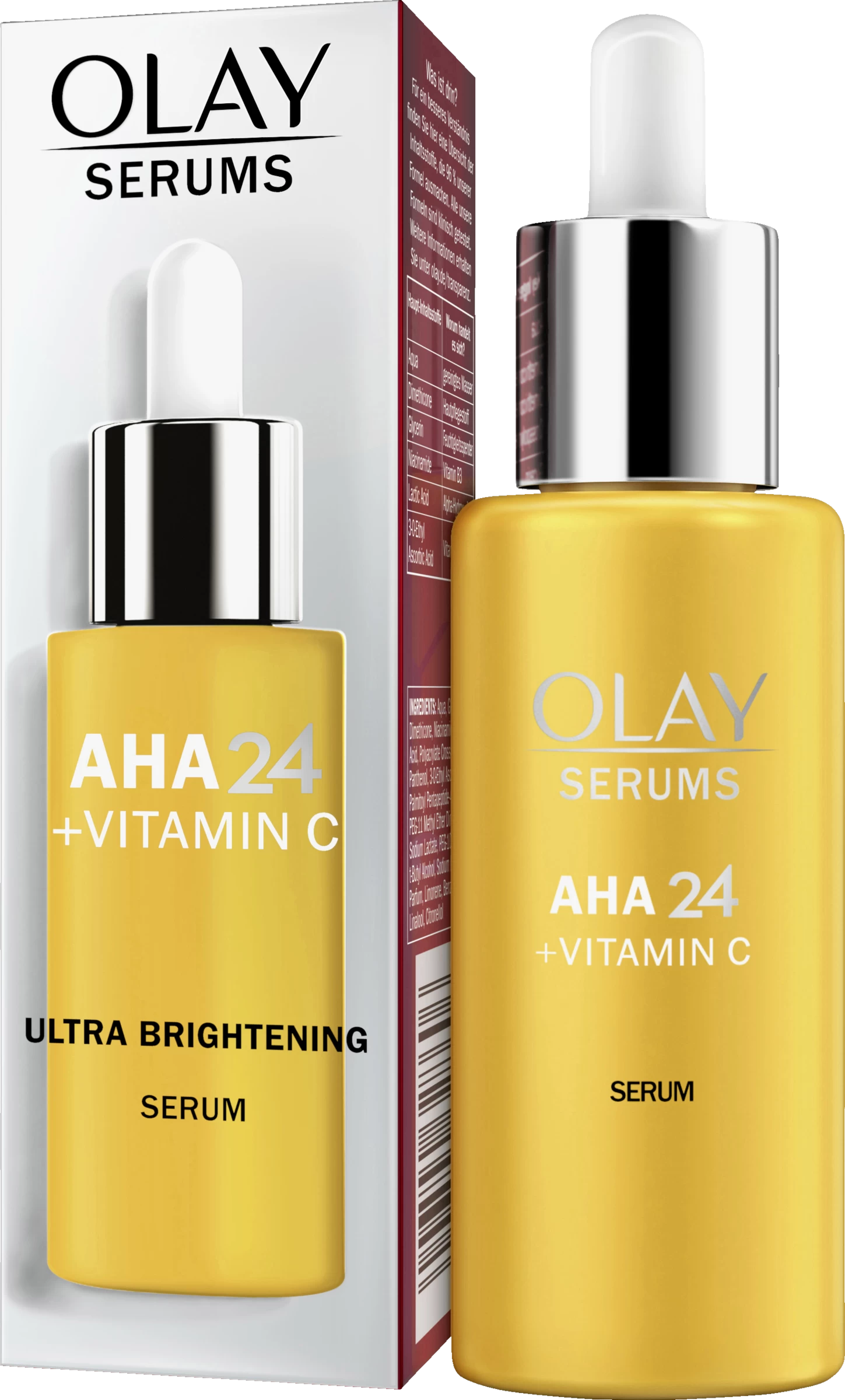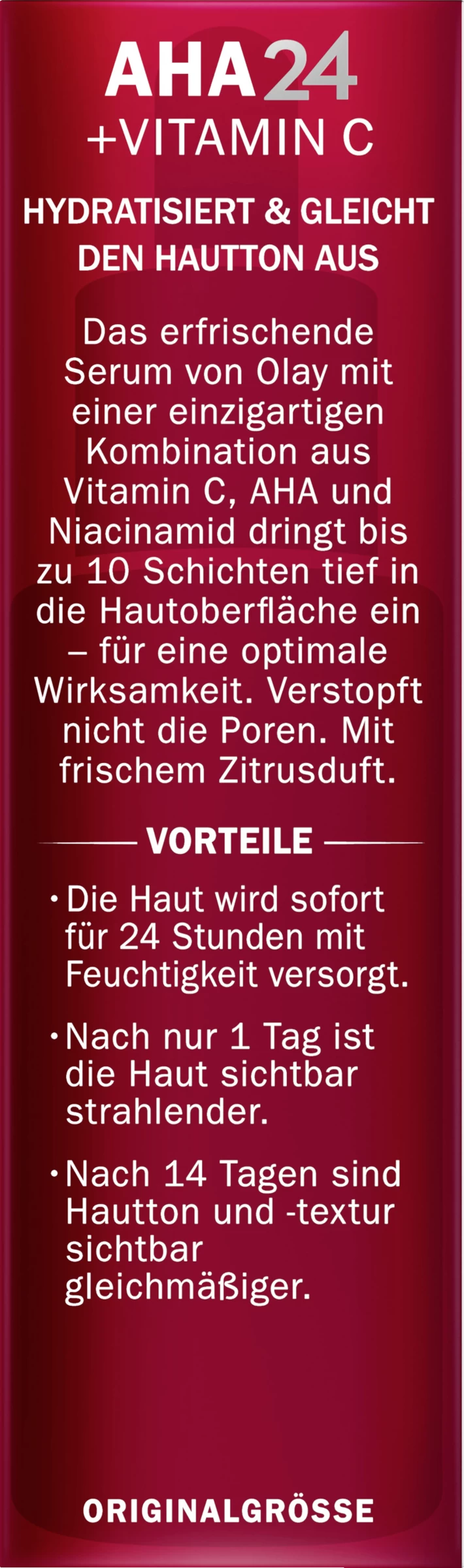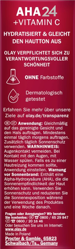 Fahle Haut? Lassen Sie Ihre Haut strahlen mit dem Olay AHA24 + Vitamin C Serum! Es sorgt für strahlendere Haut in nur 1 Tag und für einen sichtbar gleichmäßigeren Hautton sowie eine sichtbar ebenmäßigere Hauttextur in nur 14 Tagen. Außerdem versorgt das Serum die Haut 24 Stunden lang mit Feuchtigkeit. Die seidige und leichte Serumformel mit Zitrusduft zieht schnell in die Haut ein, ohne dabei die Poren zu verstopfen. Sie enthält kraftvolle Inhaltsstoffe wie AHA, Vitamin C und Niacinamid, welche dabei helfen Ihr inneres Strahlen nach außen zu bringen. Verwenden Sie das Olay AHA24 + Vitamin C Serum morgens und abends, tagsüber gefolgt von einem LSF. Das Serum enhält keine Farbstoffe und ist klinisch getestet.