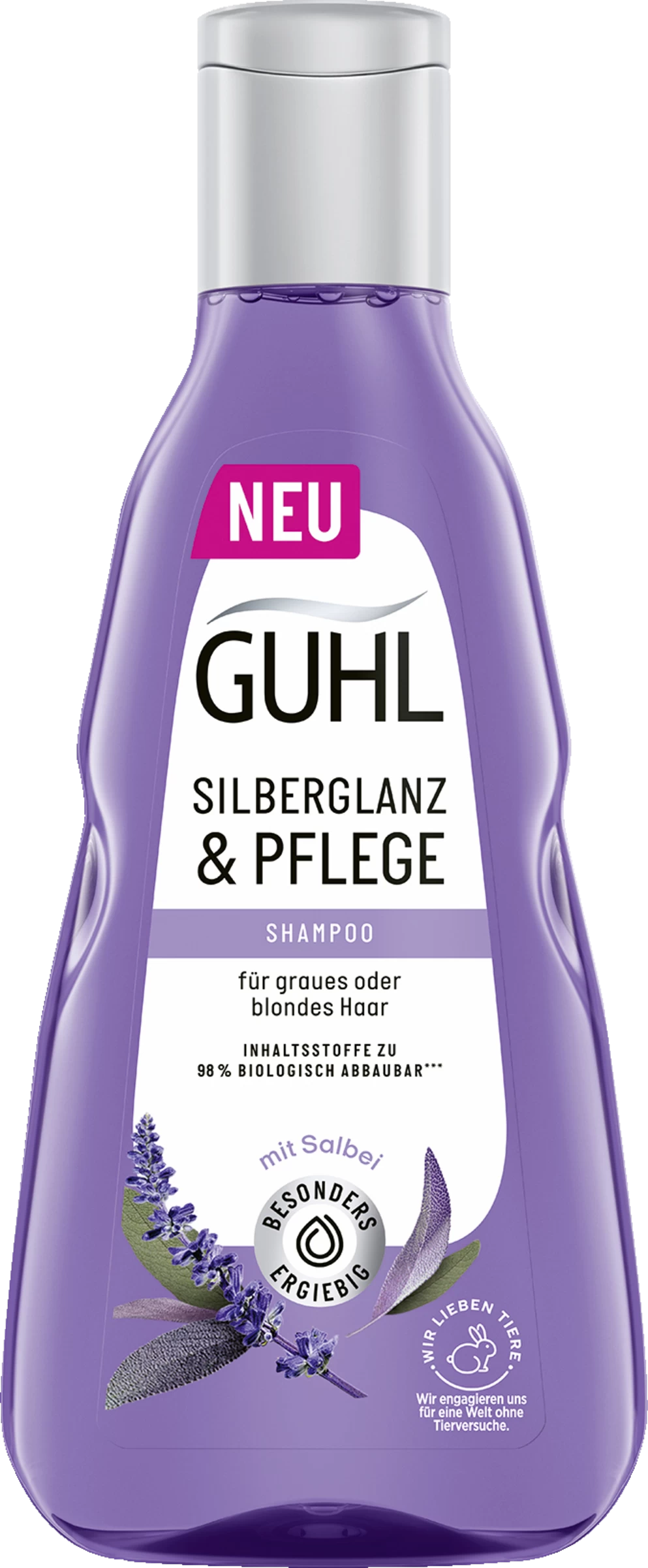 Guhl Silberglanz & Pflege – umweltschonende Anti-Gelbstich-Pflege. Die Formulierung mit mineralstoffreichem Salbei und pflanzlichem Keratin pflegt blondes, blondiertes und graues Haar bis in die Spitzen und hilft bei der Reduzierung von unerwünschtem Gelbstich. Mit natürlichen, biologisch abbaubaren Inhaltsstoffen und ohne Inhaltsstoffe tierischen Ursprungs ist die vegane Rezeptur nun noch umweltfreundlicher. Auch die Verpackungen bestehen aus recyceltem und recycelbarem Material – für eine rundum umweltschonende Haarpflege mit gutem Gewissen.
